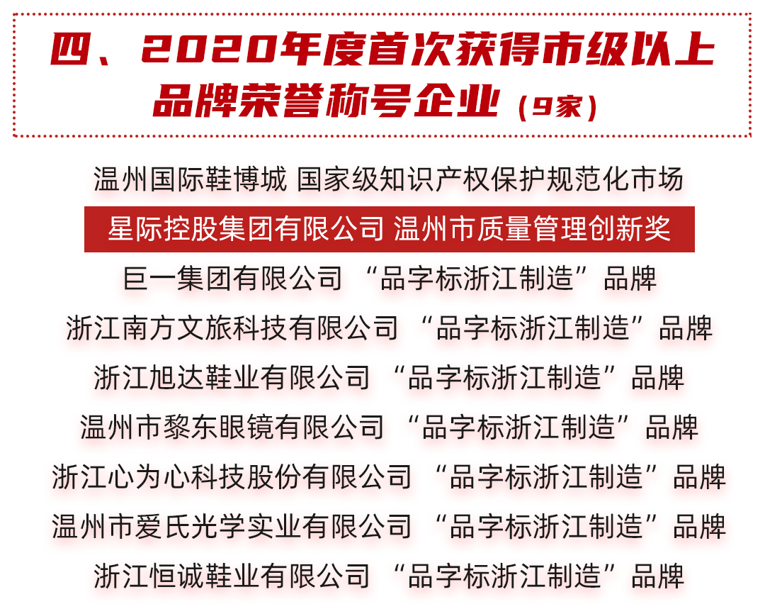此次大会表彰了2020年度功勋企业、功勋企业家等一批典型,乐鱼官方app下载最新版(中国)有限公司囊括了4项殊荣:“2020年度鹿城区功勋企业”、“2020年度工业30强”以及“2020年度首次获得市级以上品牌荣誉称号企业”,集团董事长陈序被评为“2020年度功勋企业家”。