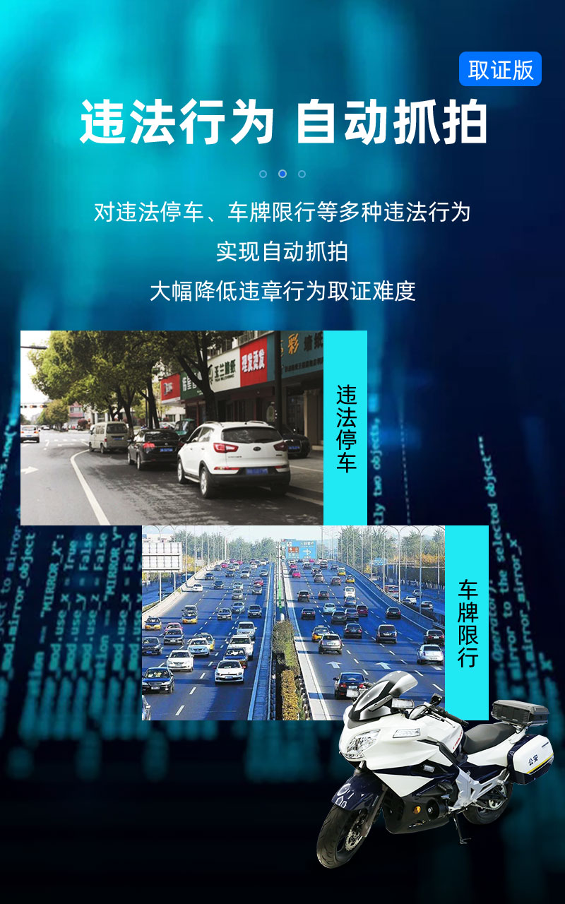 摩托车全景取证系统是根据城区道路交通流量大,汽车版取证系统在部分狭窄路段执法抓拍时可能会对后方车辆快速通行产生影响,并且城市交警也将摩托车作为巡逻的主要交通工具。因此我们在汽车版城区交警车载 全景取证系统的经验基础上,开发了这款安装在警用摩托车上,能满足城区交警部分路面管控需求的新产品。