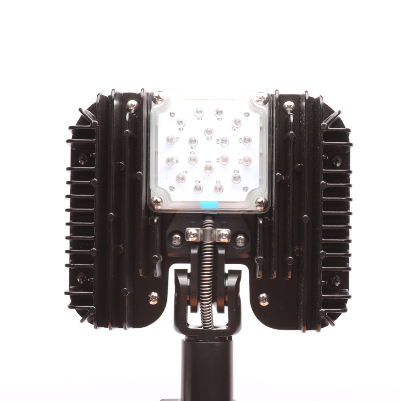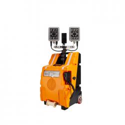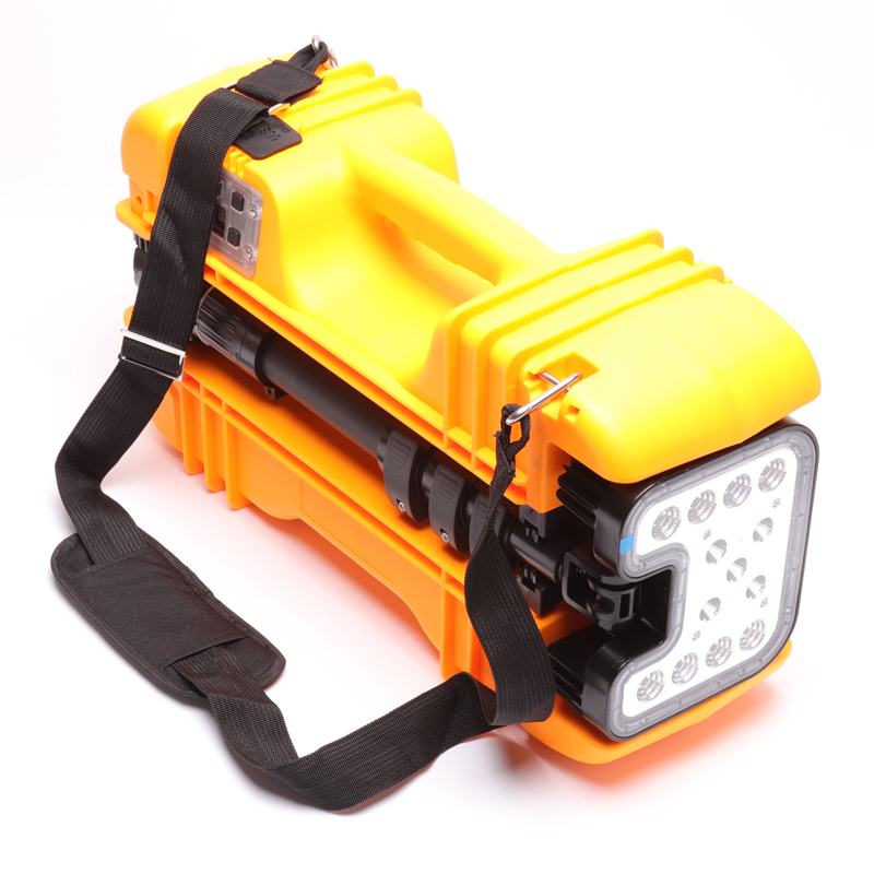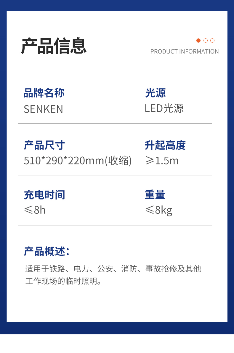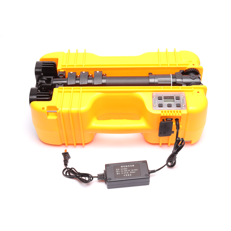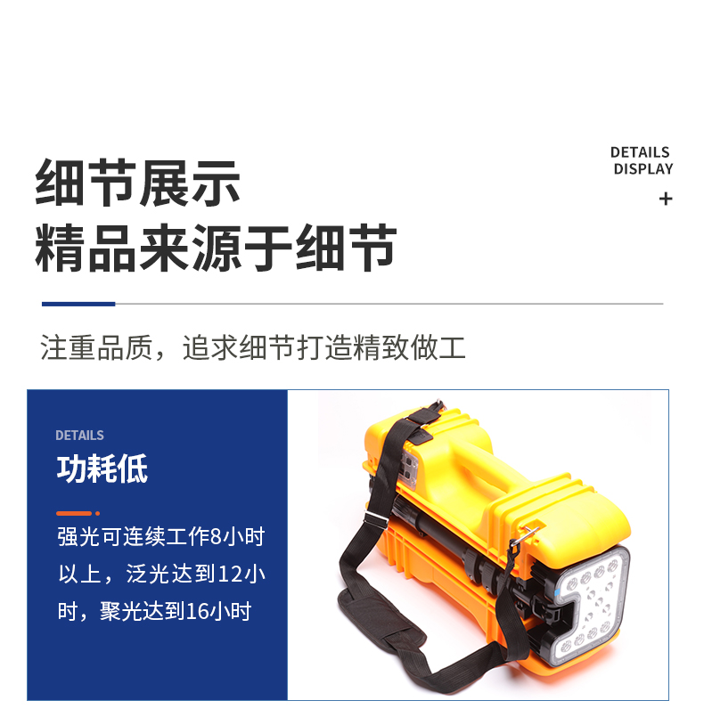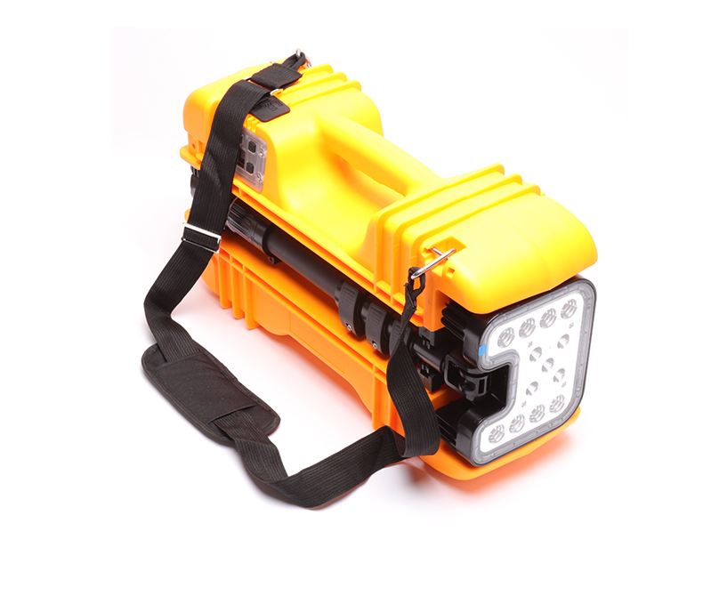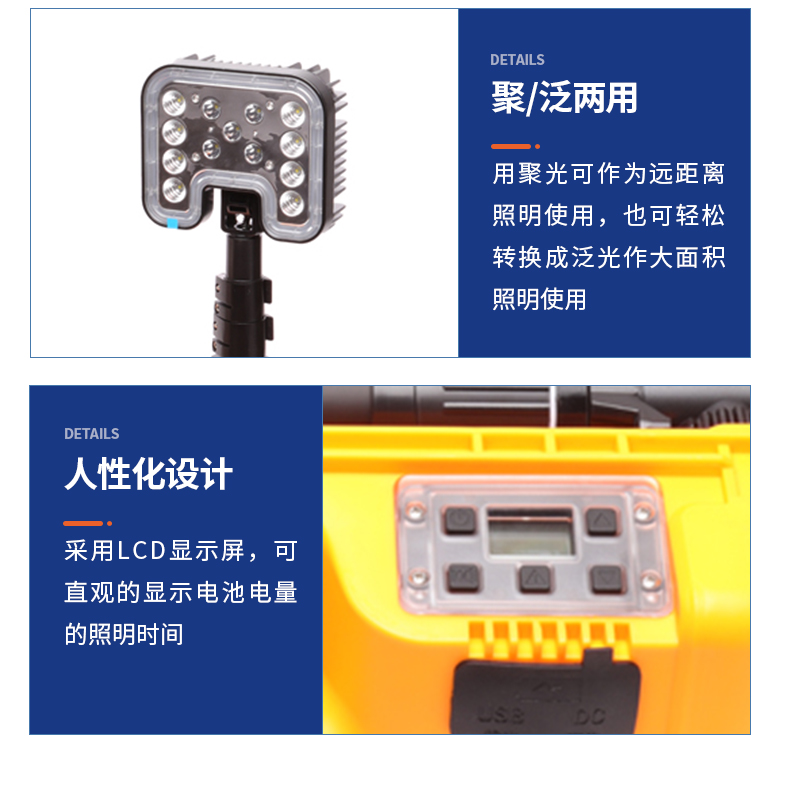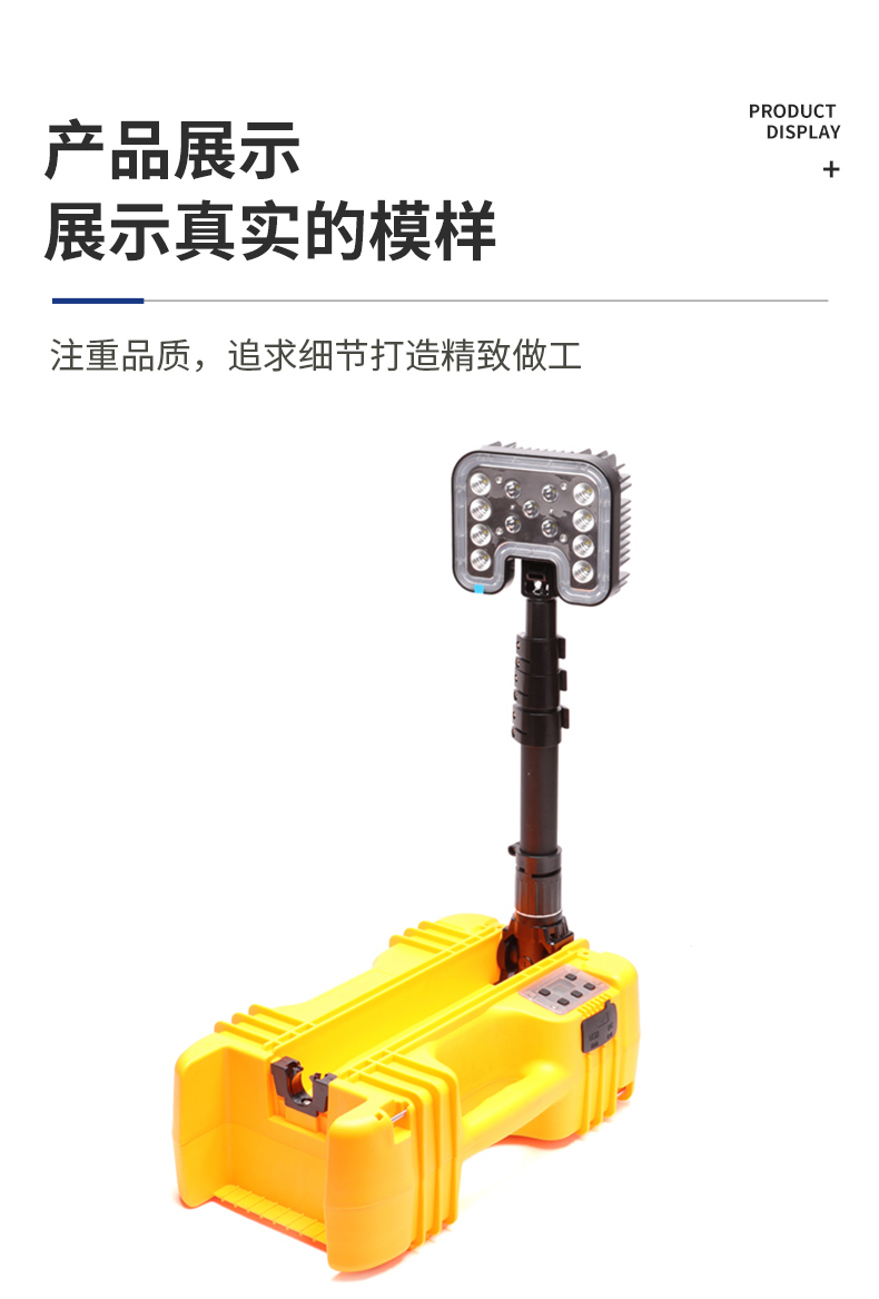 该产品体积小、重量轻,携带方便可手提、背行两种方式。采用国际品牌LED光源,发光效率高,使用寿命长达10万小时。超低功耗,强光可连续工作8小时以上,泛光达到12小时,聚光达到16小时,照明亮度可进行10%-100%无极调光匹配现场使用。灯头背部设置有红黄双色警示灯,可通过灯具上的按键进行警示灯模式调节。灯头采用四节升降杆固定,最大升起高度可达1.5米,且灯头可进行水平360°旋转,垂直180°旋转调节,满足各种情况下的照明需求。该产品适用于铁路、电力、公安、消防、事故抢修及其他工作现场的临时照明。