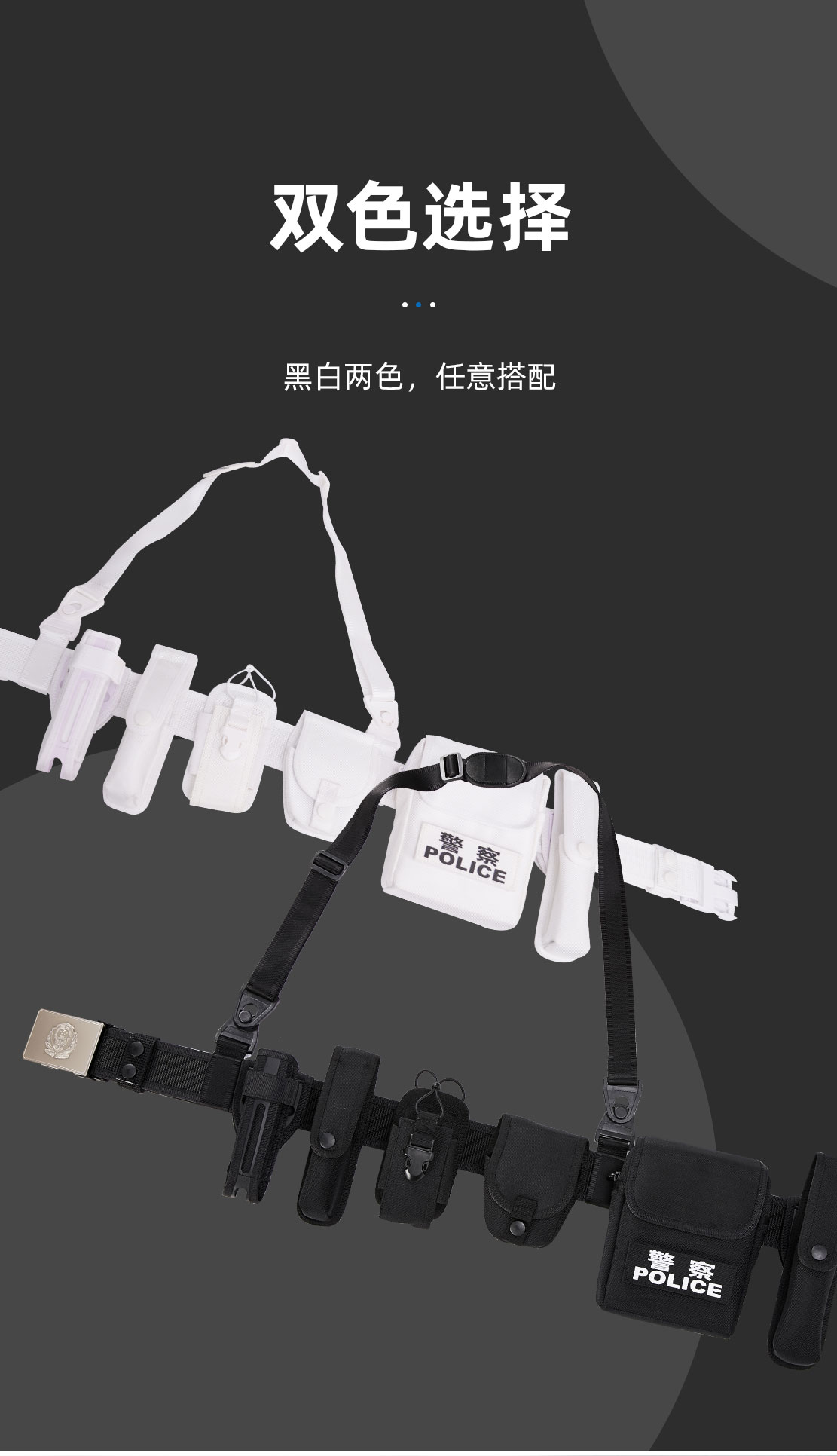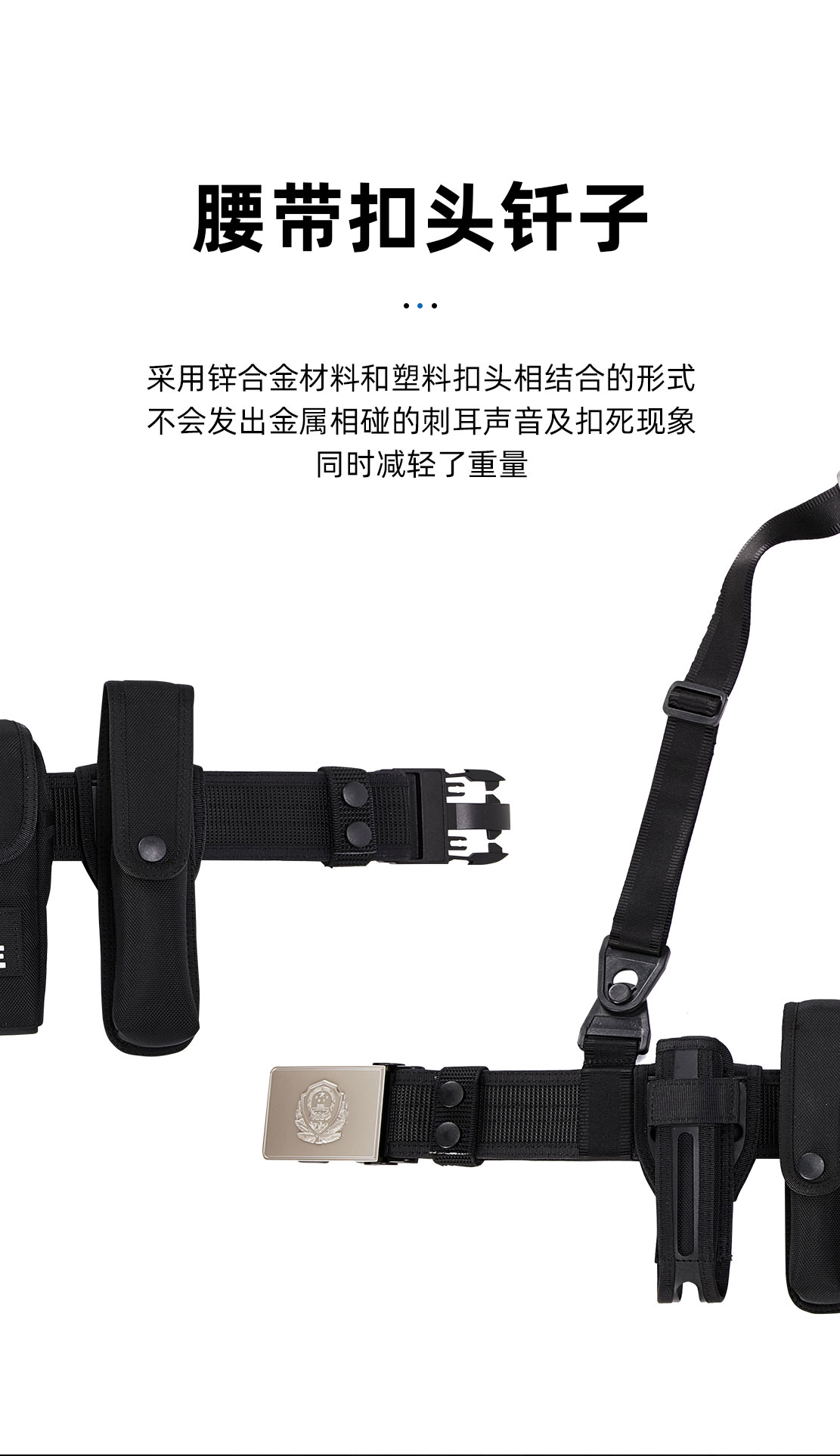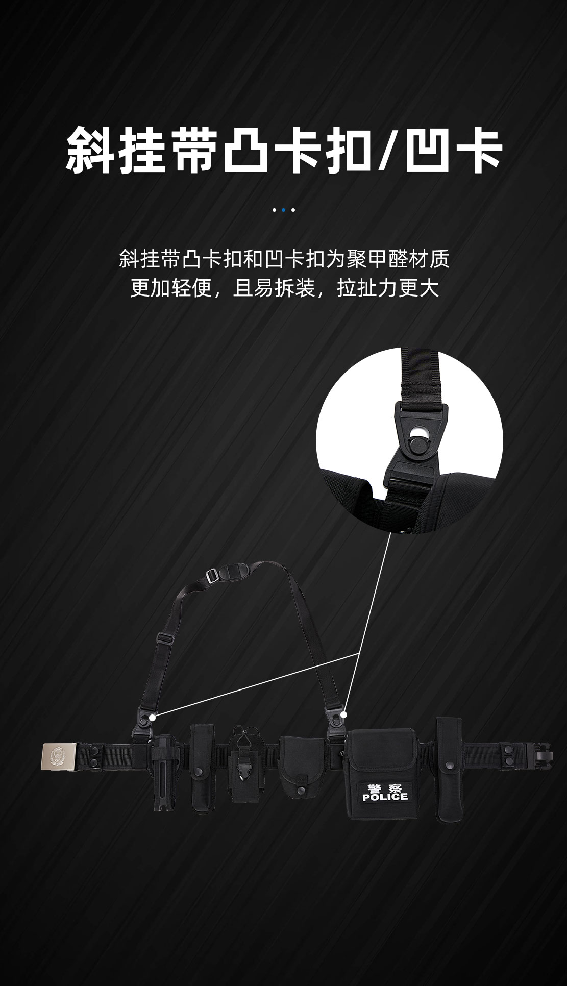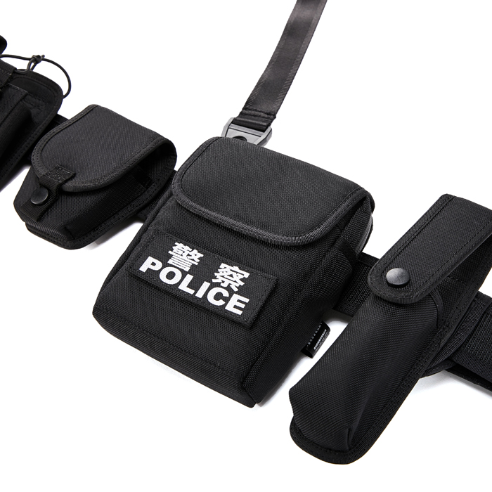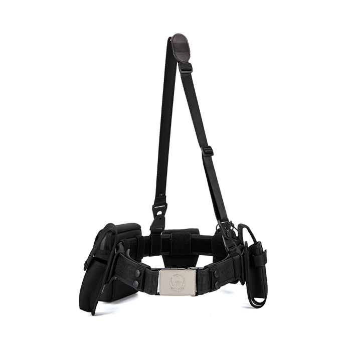 该款腰带是根据执法人员实际使用情况新研发生产的腰带。腰带主体一般采用尼龙编织,其由腰带扣头钎子、内腰带、带体、斜挂带和五个装具套(手铐套、强光手电套、警用工作包、快拔警棍套快拔、便携警棍套、催泪喷射器套、装具套可单独拆卸)组成,装具套后袢与腰带采用滑动式和固定式两种可拆卸式结构。可调整长度及组件位置,具有透气性好,易洗快干,穿着舒适。所有套具均做轻量化设计,整体重量减轻,适合长时间挂载执勤、巡逻、围捕等实战使用。