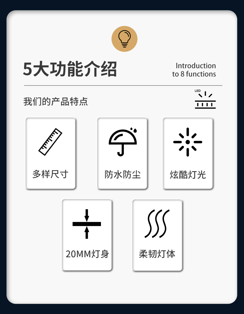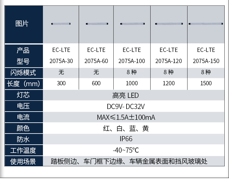 LTE2075A是我公司以细、薄、具有一定柔韧性为特点开发的一款中高端产品,为车辆更多位置创造警示和照明功能,是提高车辆安全和警示效果的不二选择。 适用于警车、救护、消防、校车、工程等车辆安装应用。