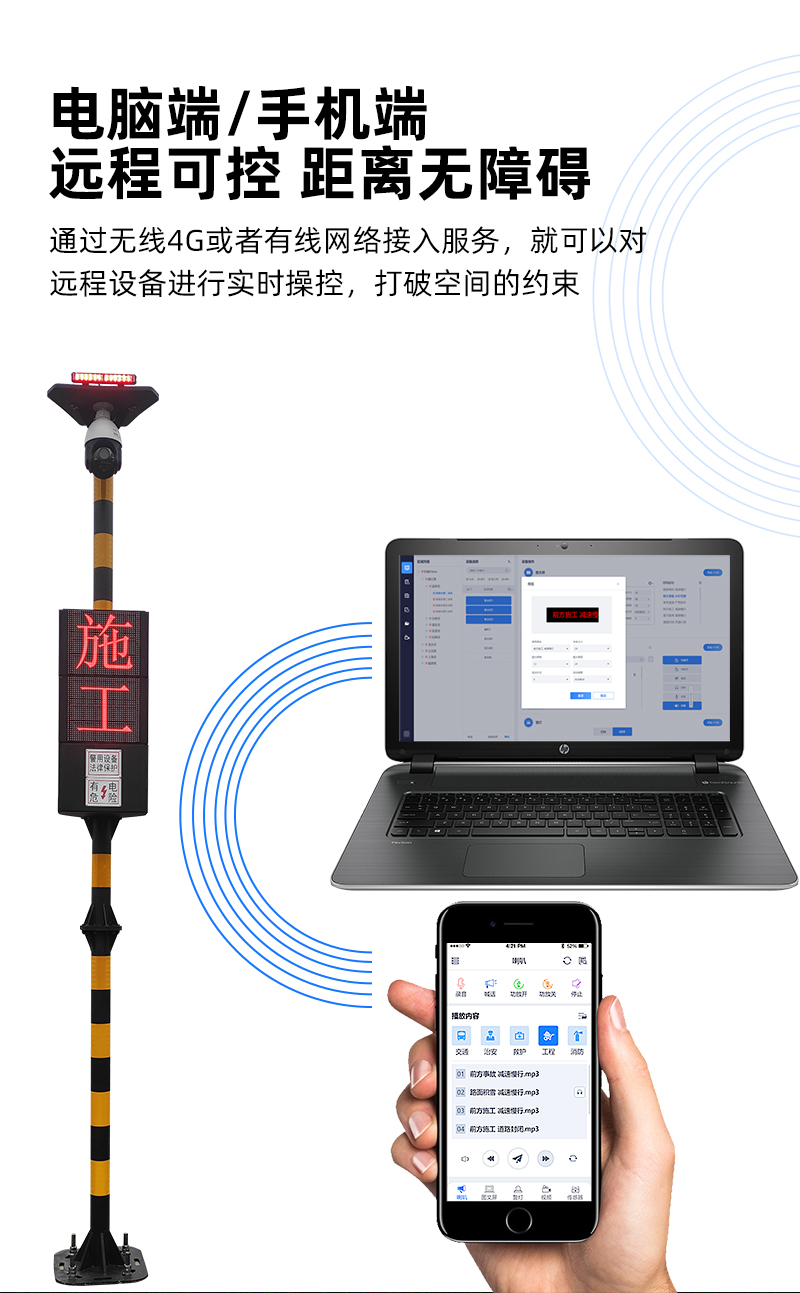具有远程预警控制,显示屏信息发布,带警灯提示,带喇叭预警,带摄像取证,带红外感知功能。主要可用于交通执法、交通预示、监狱、治安、等场所指挥;也可用于高速道路疏通、警示、预警、交通检查、森林防火、大型水库险情、监狱等场所作广播、警报设备之用(具体功能有所不同)。