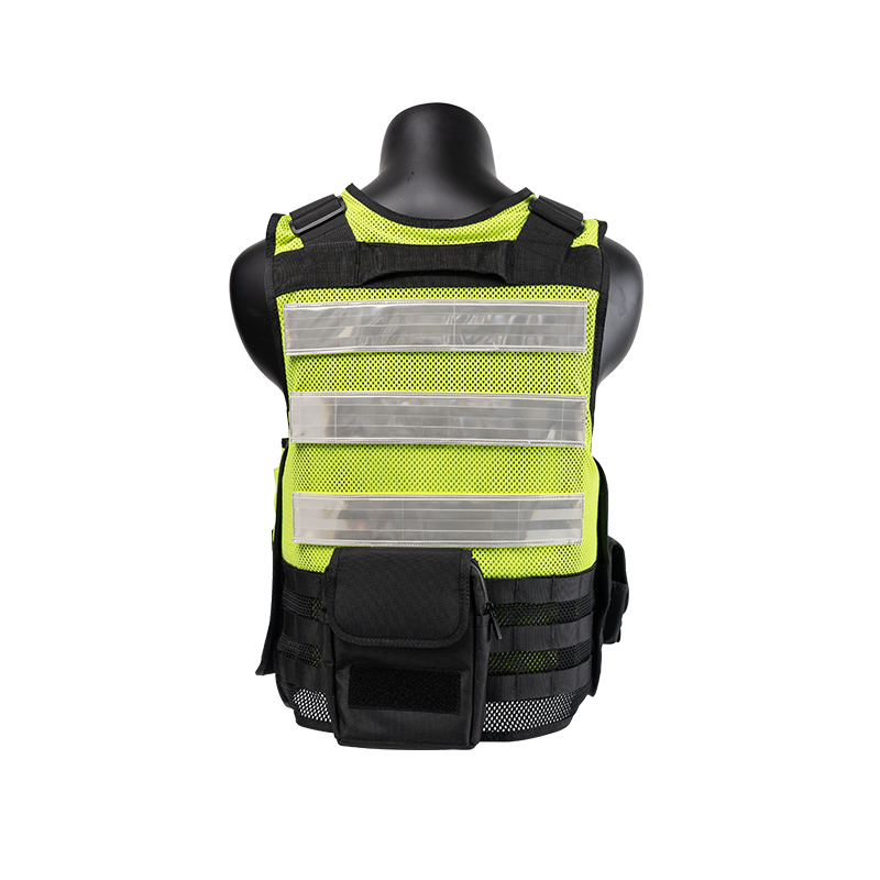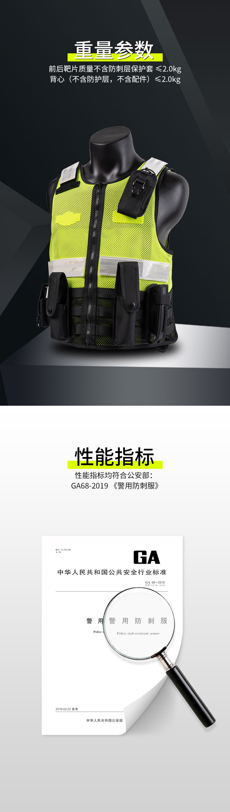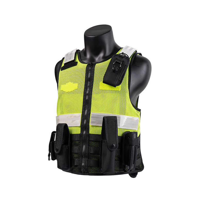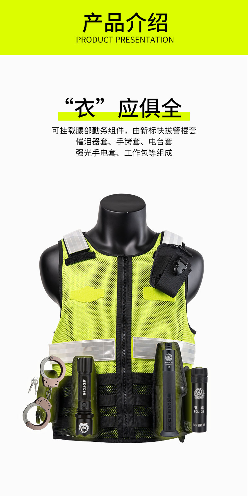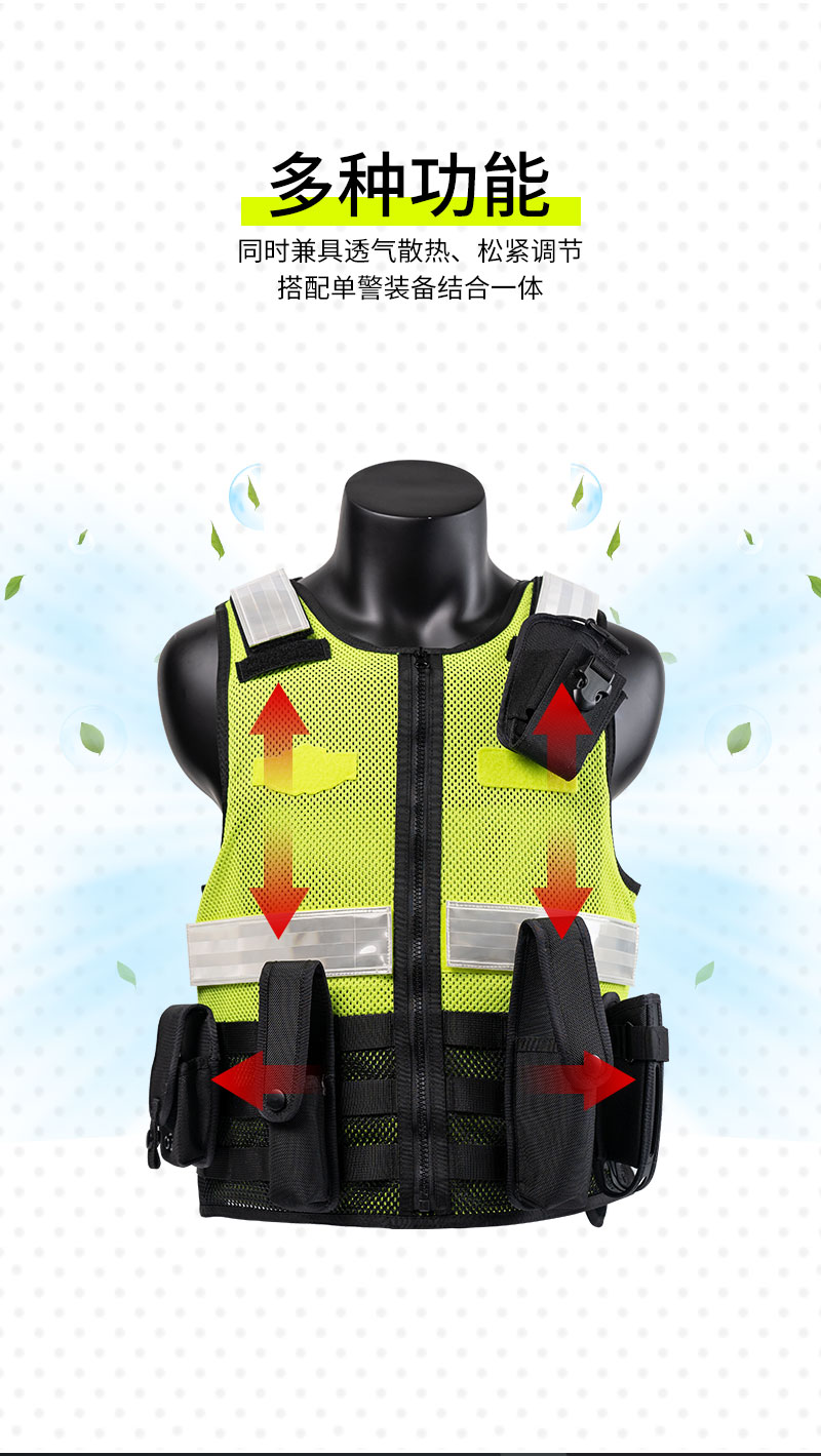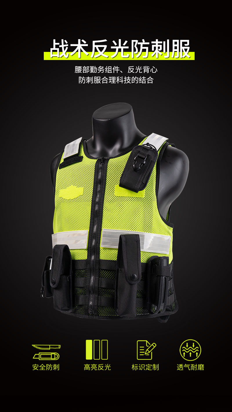 战术反光防刺服将腰部勤务组件、反光背心、防刺服科技合理地结合,兼具透气散热、松紧调节、防护防刺、舒适柔软、集成负载等多重优势。整体采用开襟背心样式,穿套快捷,亦可满足不同穿着者体型。腰部搭载的Molle系统可挂载腰部勤务组件,满足日常执勤装备负载需要。可广泛适用于公安干警、安保维稳等日常执勤、巡逻防护。
