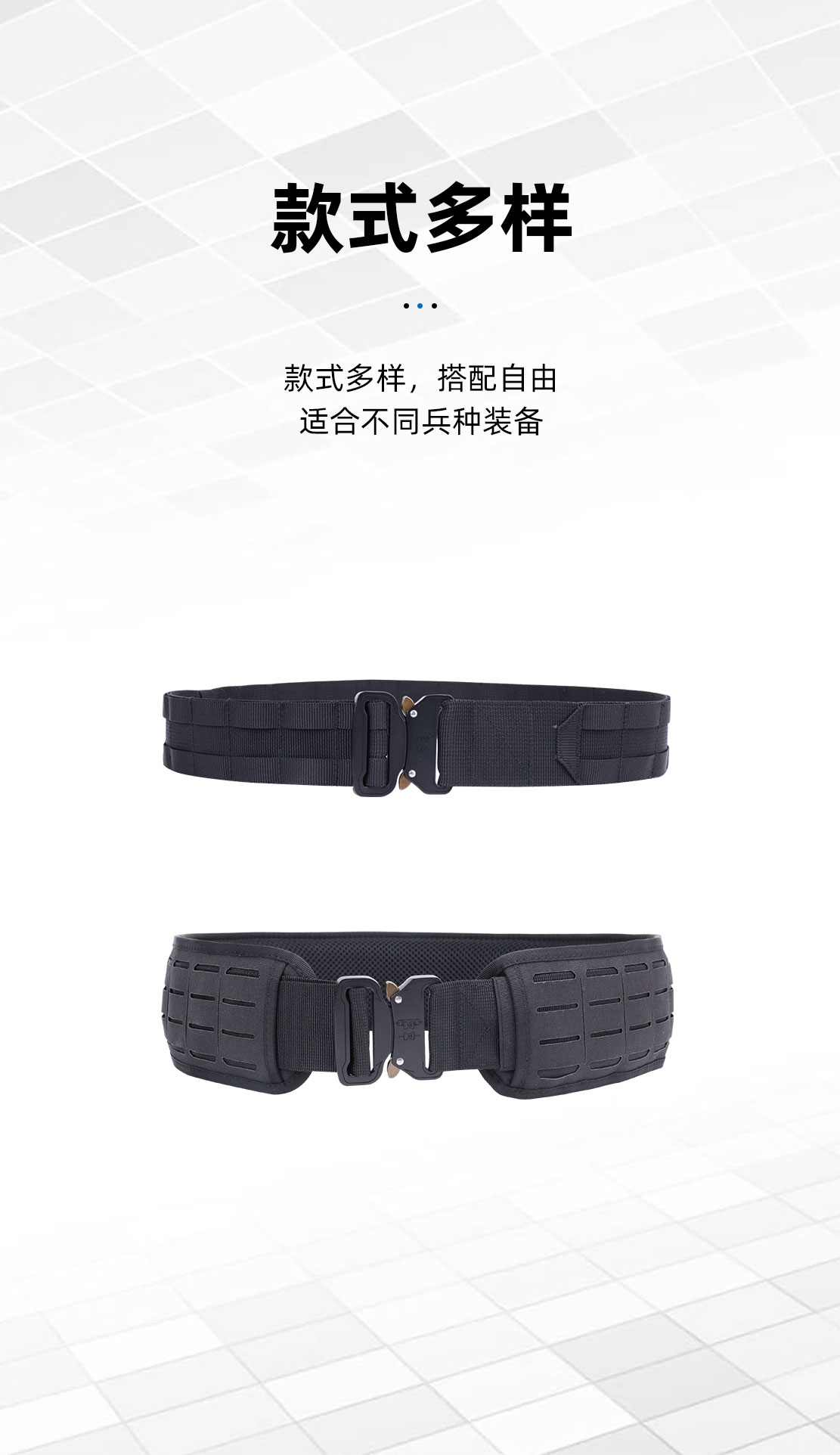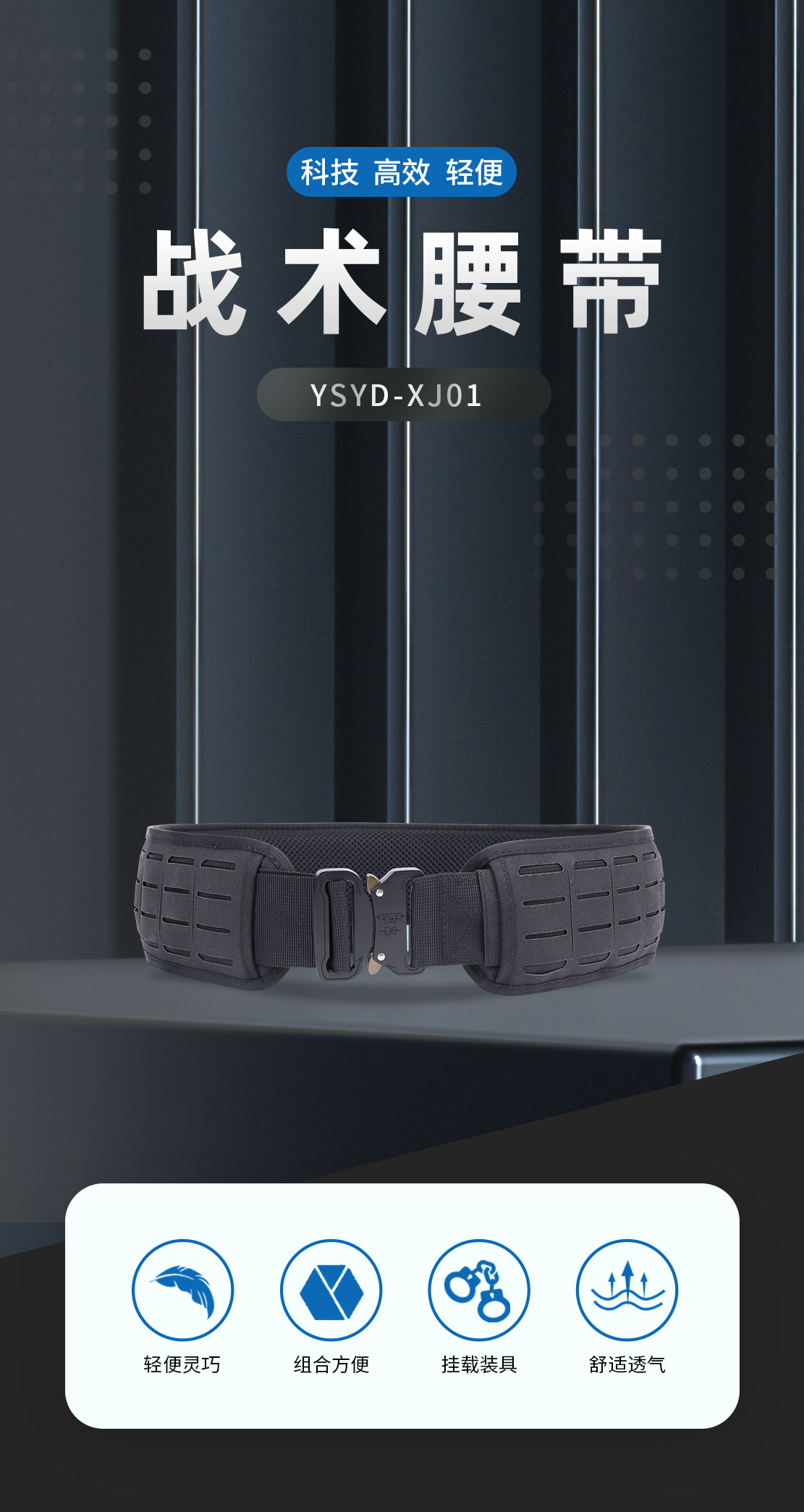 战术腰带是根据执法人员实战使用情况研制而成。可根据使用需要搭载警棍套、强光手电套、工作包、手铐套、催泪喷射器套、对讲机套、警用水壶套、弹匣套、手枪套等装具套,适用用于公安干警、特警、交巡警及安保维稳等国家行政执法机关的日常执勤、任务等情况。