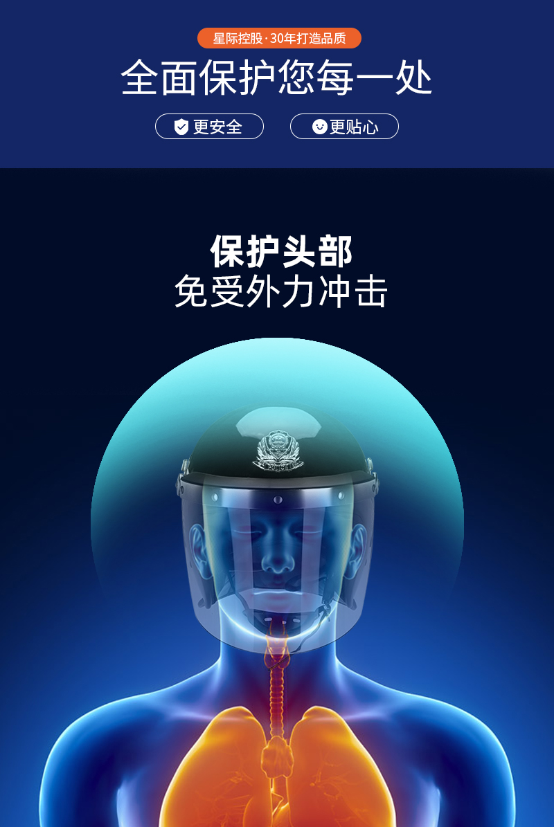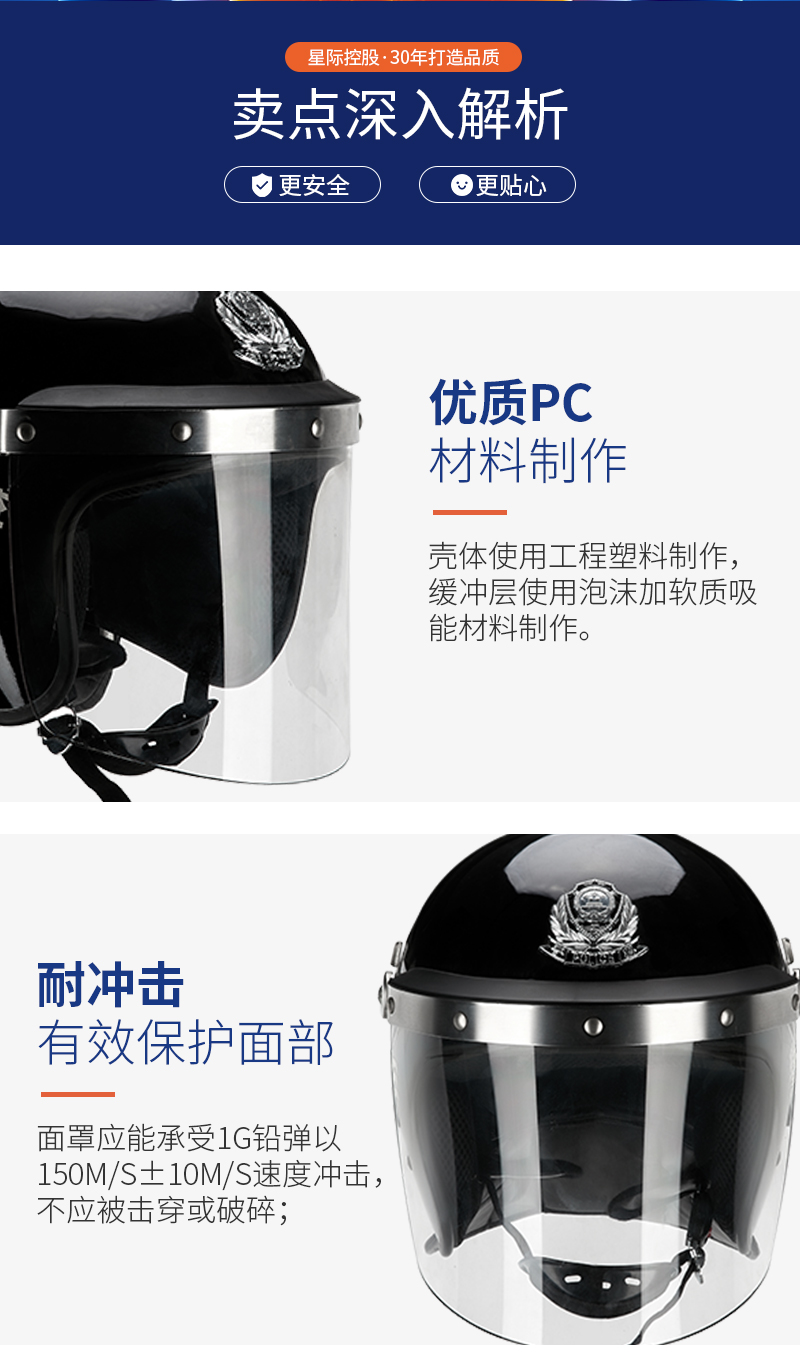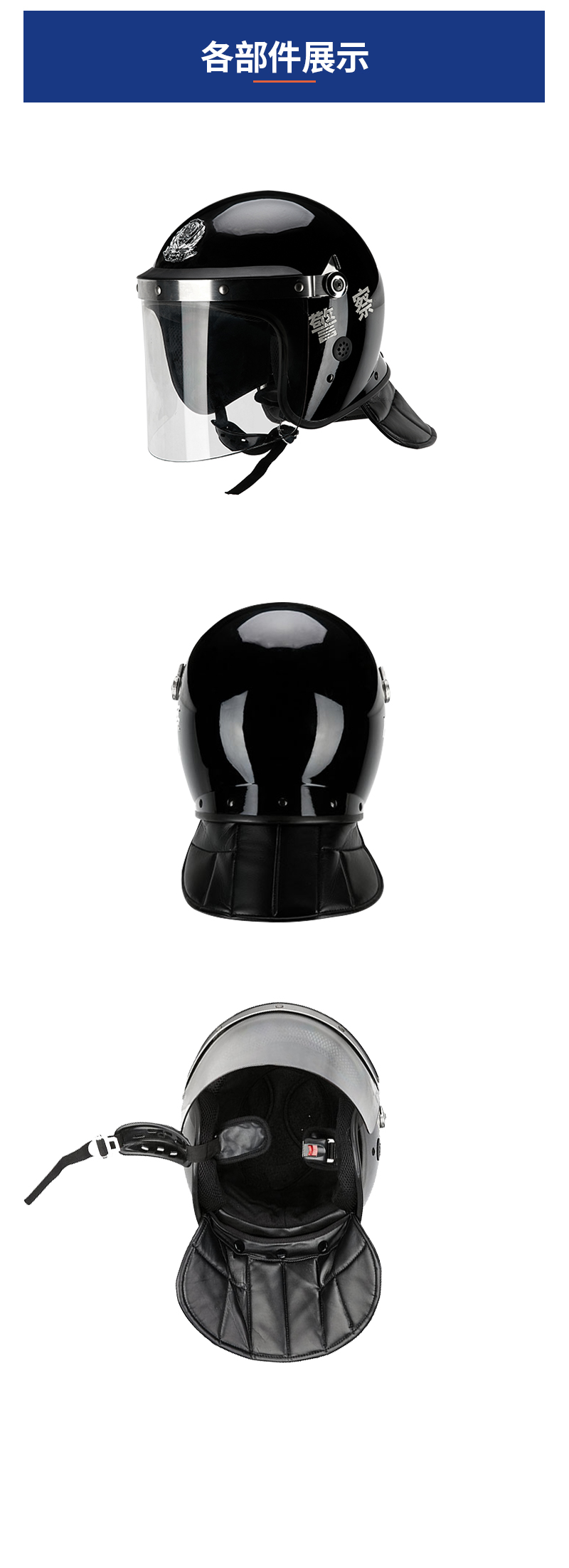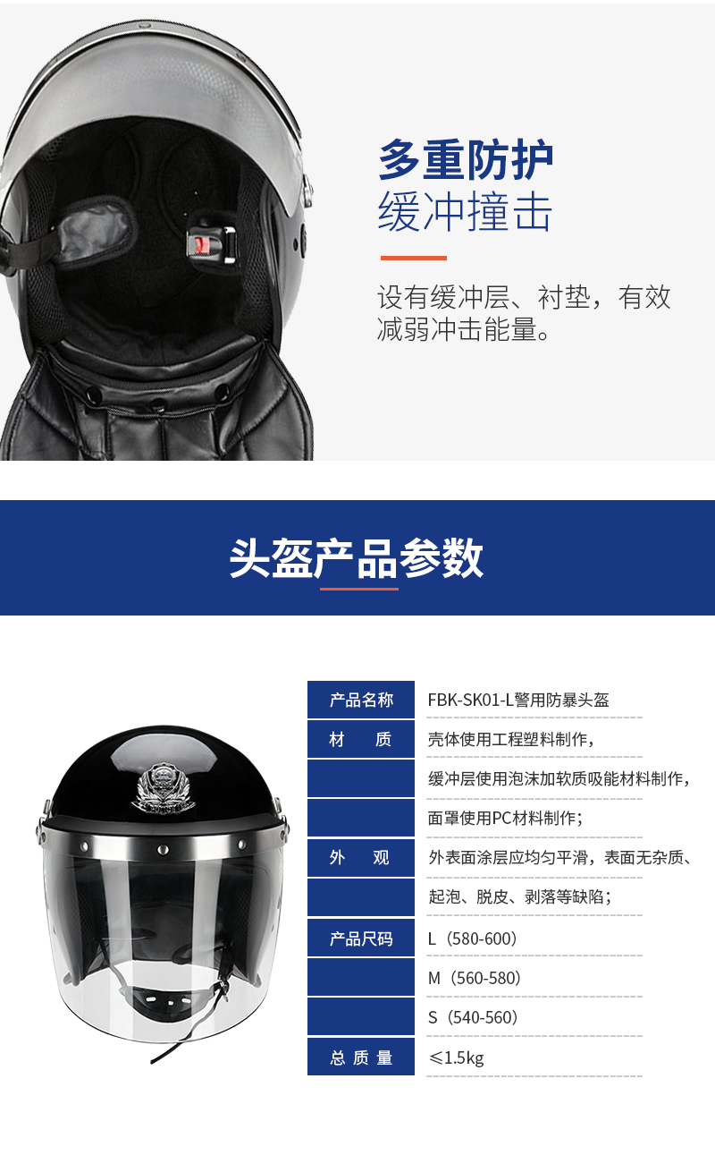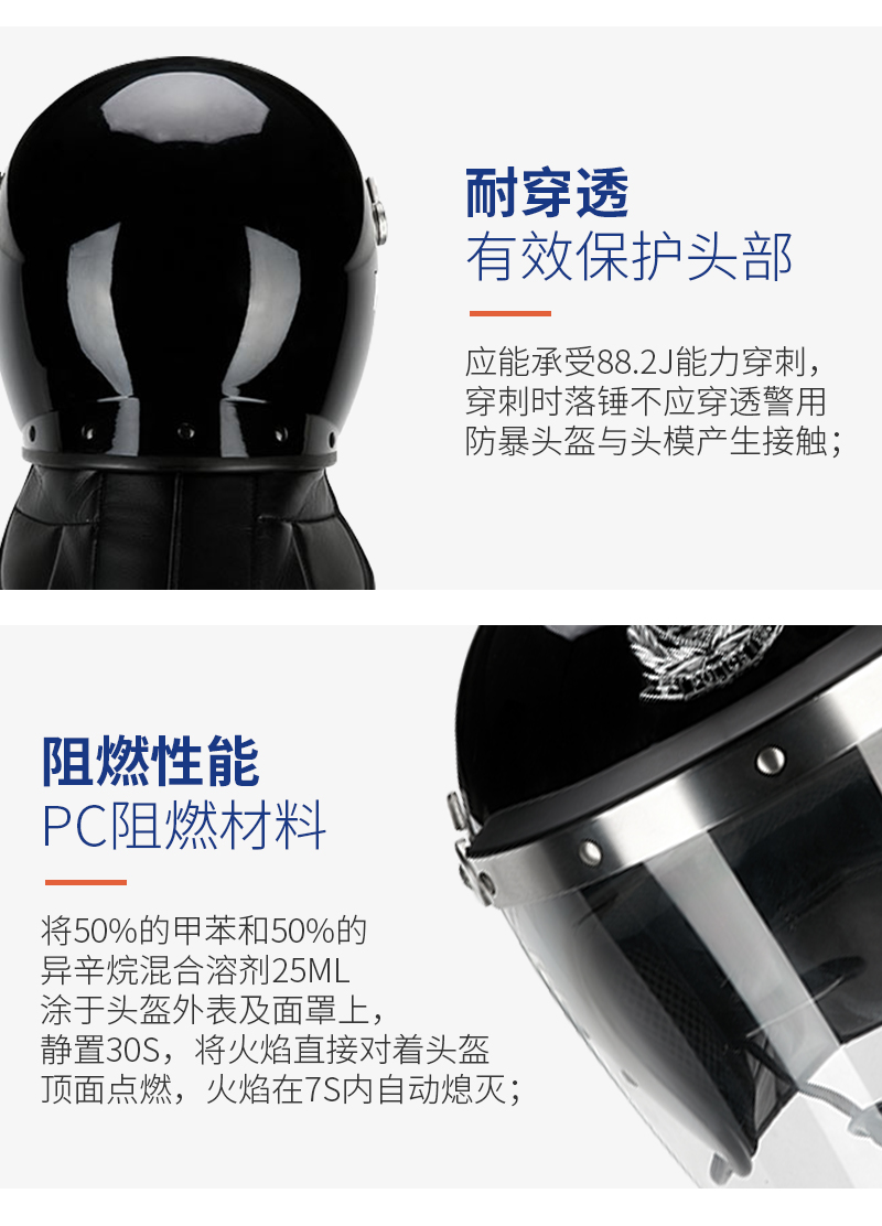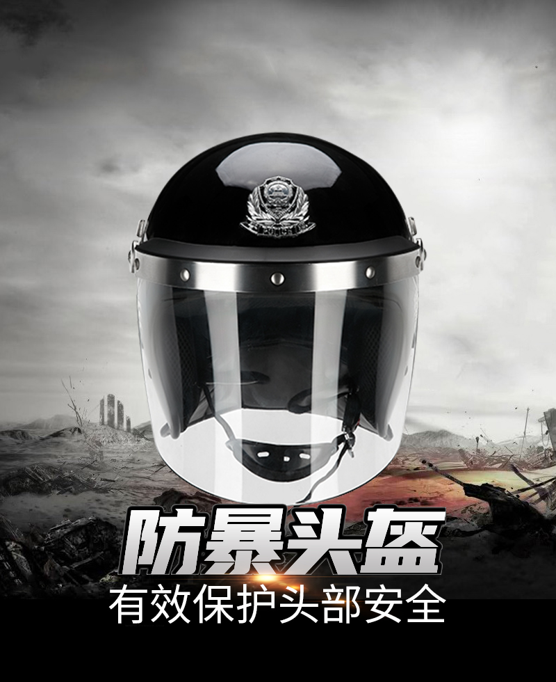 警用防暴头盔是一种保护警务人员在执行公务时抵御头部及面部受到打击伤害或其它潜在的伤害(如泼洒腐蚀性化学液体)的一种警用装具。其壳体按公安部防暴头盔标准壳型设计,并采用 PC 合金制造,具有质轻、强度高,外形美观、线条流畅,面罩镜片透光率好,视野开阔、佩戴舒适、牢靠、穿脱简便等优点是警务人员在反恐反暴斗争中为保障自身安全必备的防护用品。