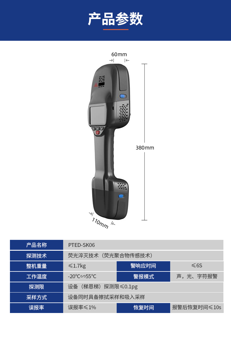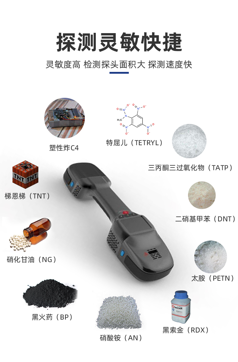 便携式痕量炸药探测器采用新的荧光聚合物传感技术,是一种基于物质分子对荧光聚合物所发射荧光的光度变化实现对物质分子识别的技术。通过擦拭采样或吸气采样,当检测到炸药分子,聚合物发射的荧光瞬间由亮变暗,通过检测聚合物的荧光强度即可识别周围环境中是否有炸药分子存在。
