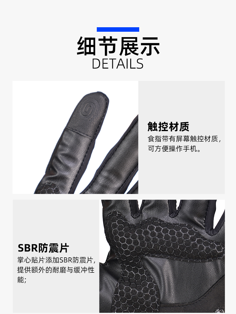 夏季骑行手套的手指手背设计有碳纤护具,手心设计有SBR防震片,手掌采用耐磨布料,保证安全、防滑、避震功能,食指采用可触屏设计,方便操作,适用于特警铁骑夏季骑行。