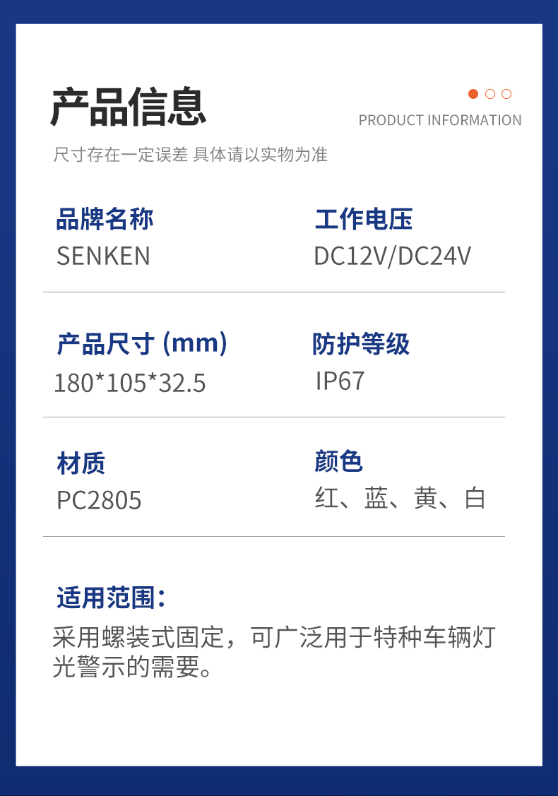 LTE595H小警灯光源采用高亮LED发光管,光源使用寿命可达10万小时以上;灯罩采用高透光材料制成,透明度高,不褪色,适合特种改装车四周安装。