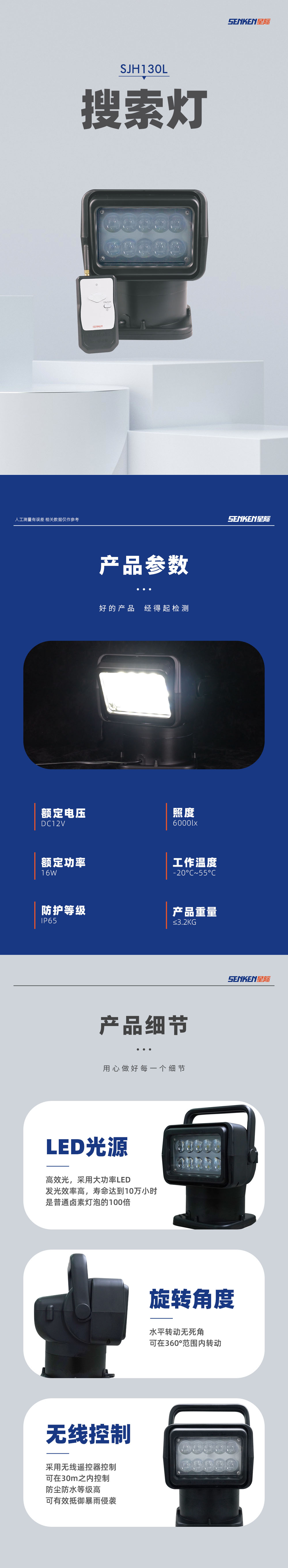 该产品为我司在原有卤素灯和氤气灯的基础上升级为贴片LED光源,增大了搜索灯的使用寿命和发光效率,光色呈白色,聚光效果好,射程距离远,赖振性好,可耐汽车长期振动和冲击。