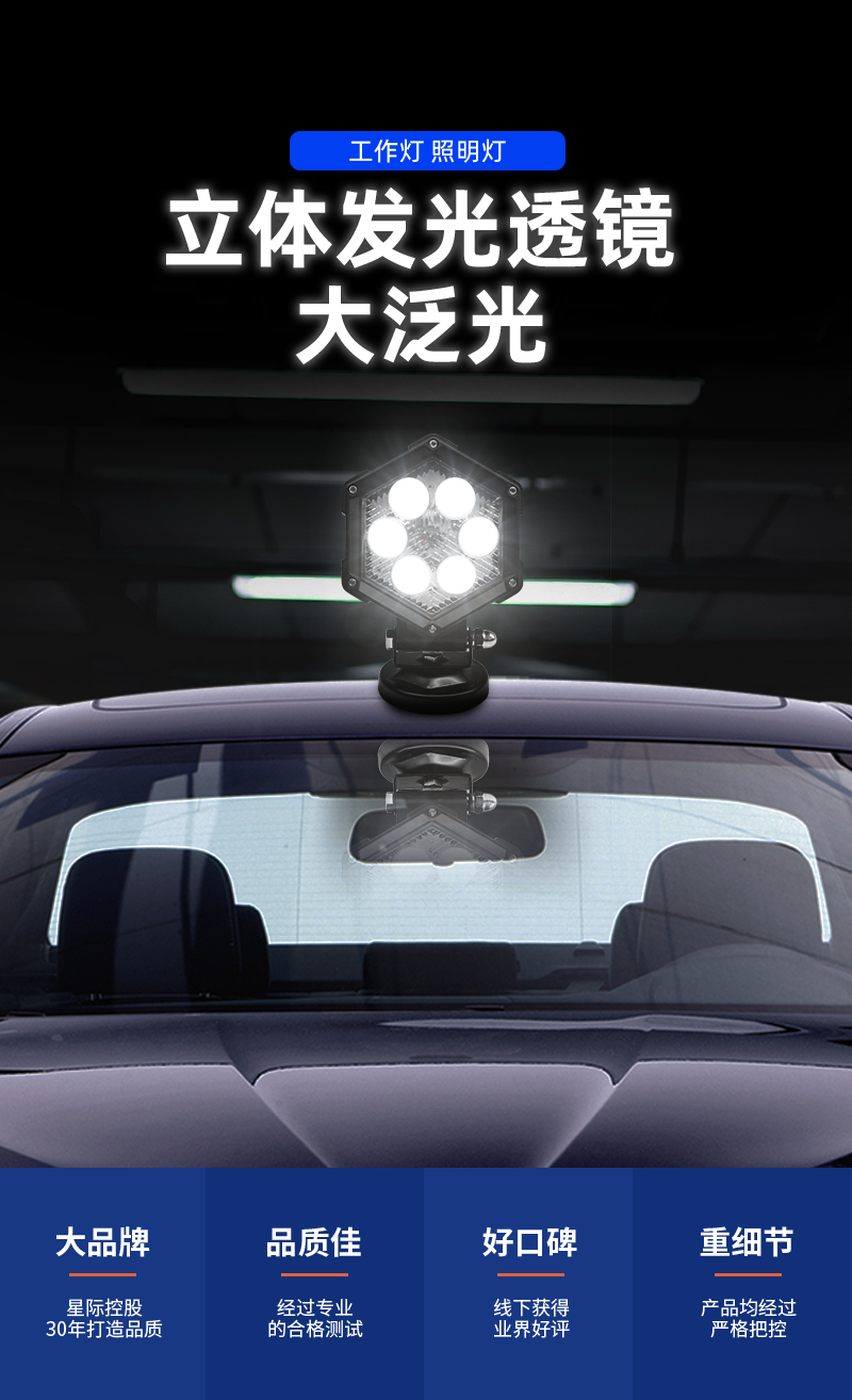 SKGD-30工作灯是本公司新开发的一款泛光型LED辅助照明灯,产品外观以六边形工业化的造型结合PC面双层透光罩,即使在太阳光下也能很好的体现剔透晶莹的质感。 适用于SUV,卡车,沙滩车或UTV的越野驾驶灯,并且还可以用于工矿车辆、特种车辆和农业车辆照明;适用范围广,可兼容配备12-24V直流电源的汽车和设备。