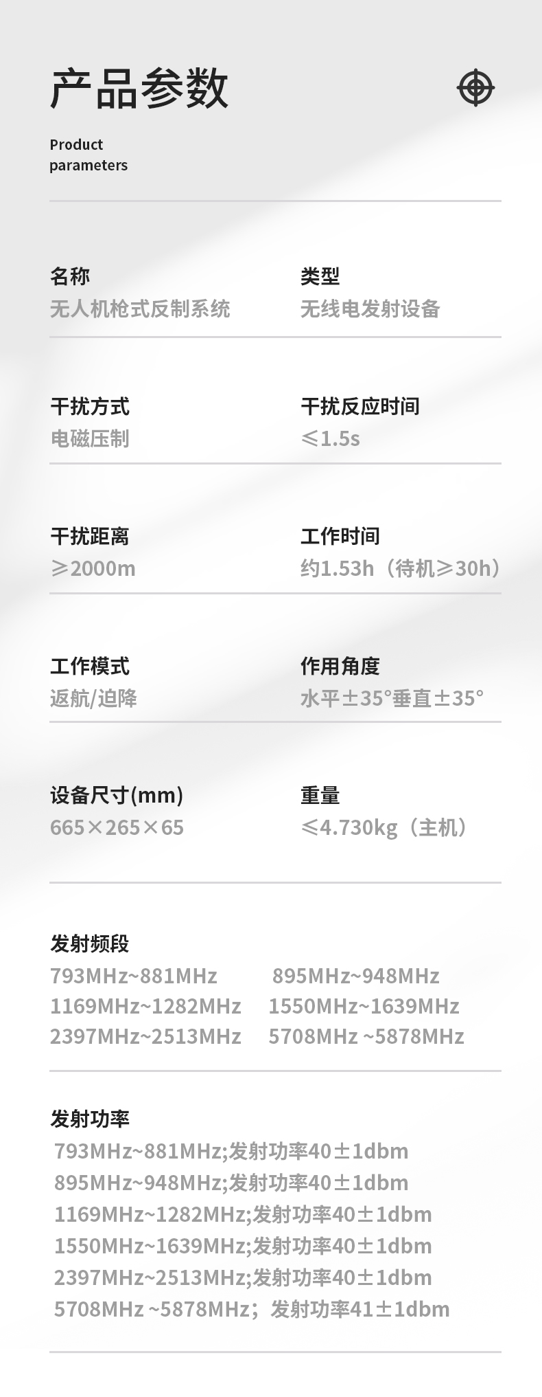 便携式反制设备通过发射电磁波信号阻断无人机和遥控装置间通信链路并可干扰无人机接收卫星导航信号,从而使无人机产生返航或迫降的效果,具备远距离的无人机目标管控能力,共有三种形态。