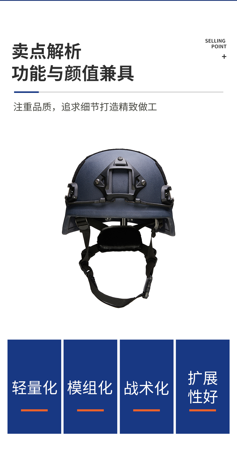战术导轨、墨鱼干基座三脚固定架,可扩展性好,可加装手电、夜视仪、摄像头、通信耳机、护目风镜、防弹面罩、防毒面具等装备。轻量化、模组化设计,海绵冲击护垫,ACH标准带弧度导轨。