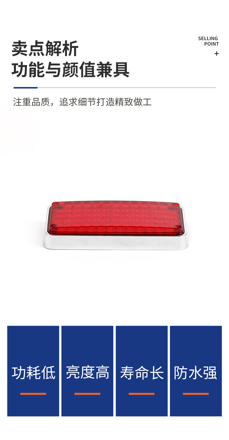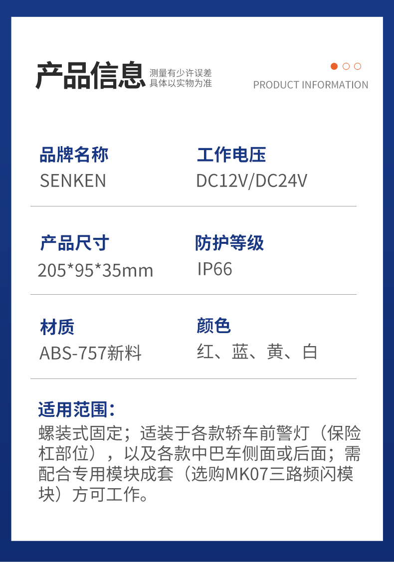 灯罩采用高透光材料制成,透明度高,不褪色;光源采用进口高亮LED发光管;螺装式固定;适装于各款轿车前警灯(保险杠部位),以及各款中巴车侧面或后面;需配合专用模块成套(选购MK07三路频闪模块)方可工作。
