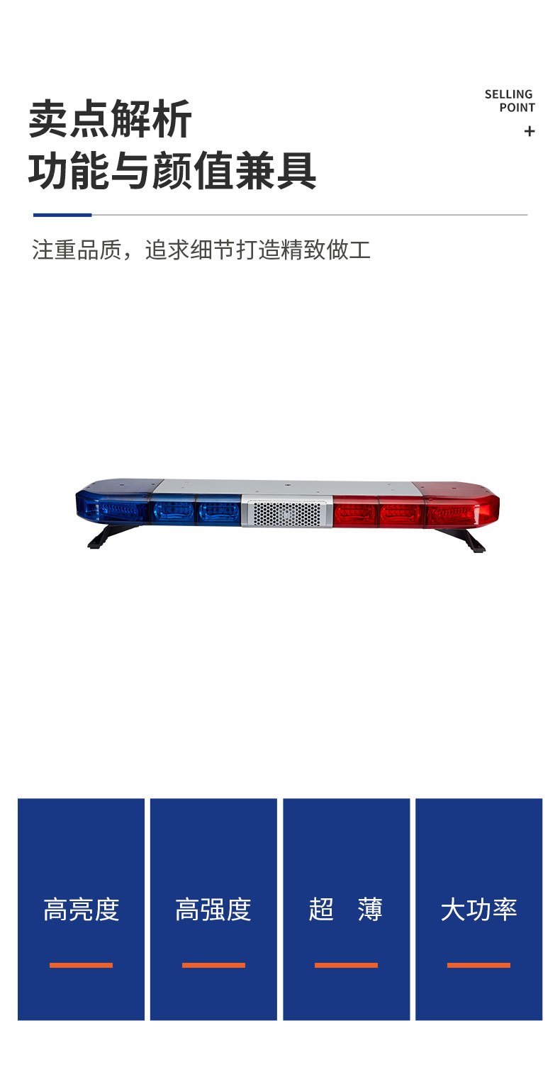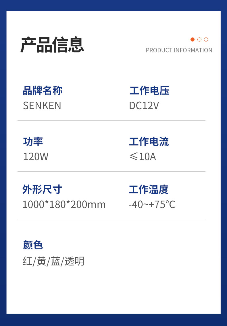TBD555系列长排警示灯是我公司新开发的一款中高档超薄长排警示灯。本灯所有灯罩采用高强度PC料加工而成,并采用先进的表面工艺处理使灯罩透光率高、不易褪色、抗振、抗拉伸、抗划伤性能强。内部光源配置采用高亮度大功率3WLED灯管能实现多种闪烁模式。本产品灯光视觉无盲区具有360°高亮度警示效果、环境适应性强,安装和维修方便的特点。可广泛用于公安消防、救护工程车辆及其它特种领域。