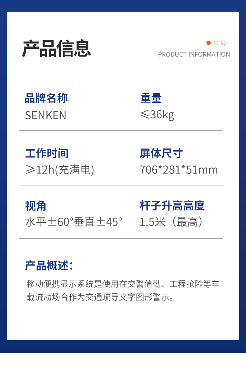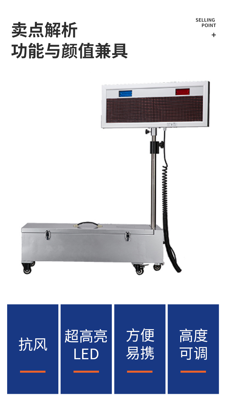移动便携显示屏适用于交警值勤、工程抢险等车载流动场合,作为交通疏导文字图形警示,是本公司广泛采纳交警管理部门等用户建议设计生产的产品,该产品具有设计结构新颖、使用方便的特点。整个设备由显示系统和便携固定系统两部分组成。显示系统主要由液晶控制盒和显示屏组成。液晶控制盒可预贮储交通、工程等现场指挥常用的警示文字图案。控制盒可随时取下离开设备。计算机电脑控制是利用车载计算机或笔记本电脑通过专用配套软件控制显示发布文字信息。 显示屏显示采用超高亮LED,工作时发光指示可在阳光下远距离可视。
