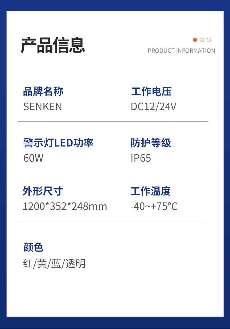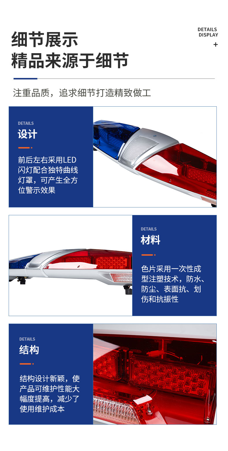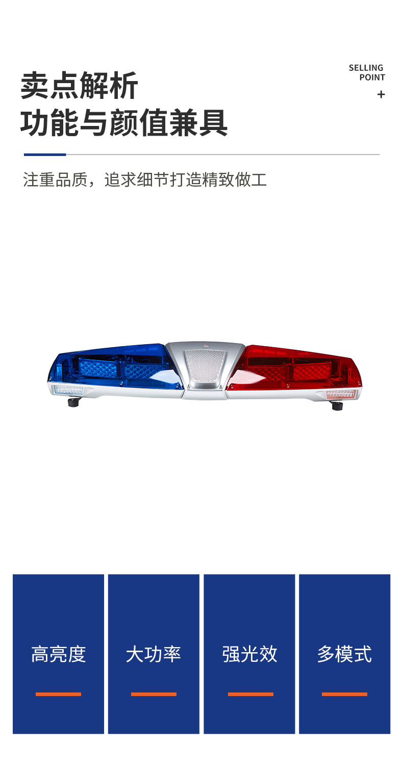 该产品采用了高亮LED光源,优化的电路和工艺设计,双声道内置扬声器布局,主光源反光镜达到了高效的全屏反射技术,发挥了强烈的震慑警示效果。不同颜色的色片采用一次性成型注塑技术,防水、防尘、表面抗划伤和抗振性能均达到国内领先水平。该产品已获得了实用新型和外观设计专利权。是目前国内中高档流线型警示产品,广泛应用于公、检、法、司及消防、工程、救护、公路、电力等中高档特种车辆作警示设备之用。