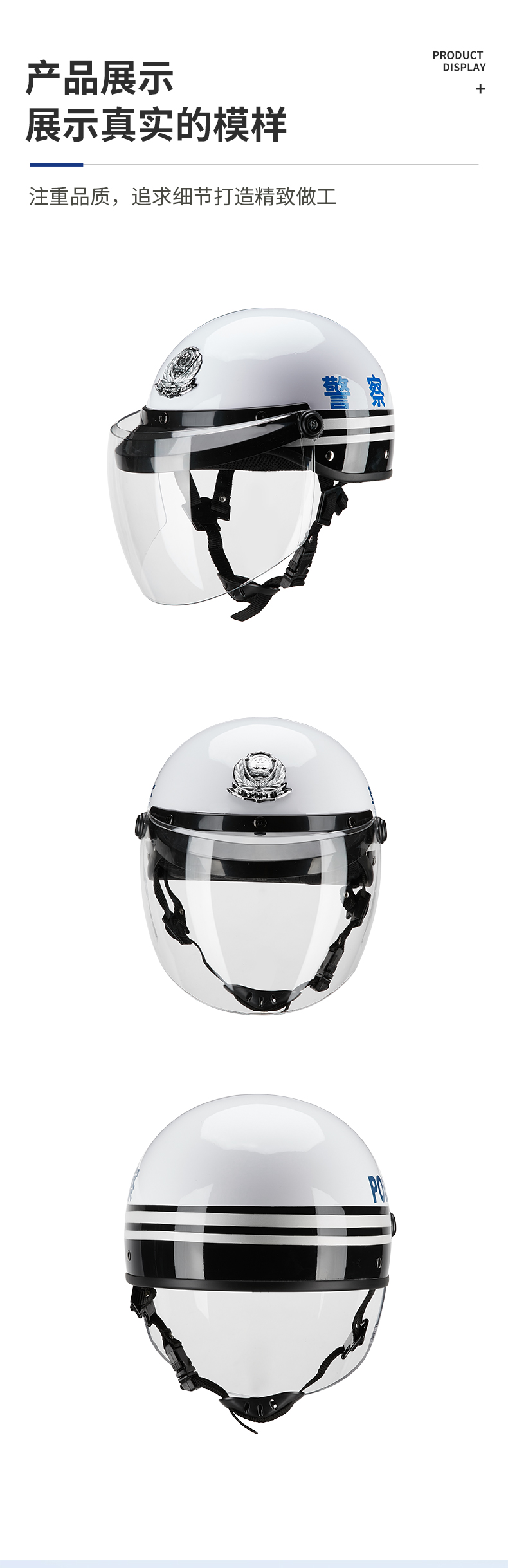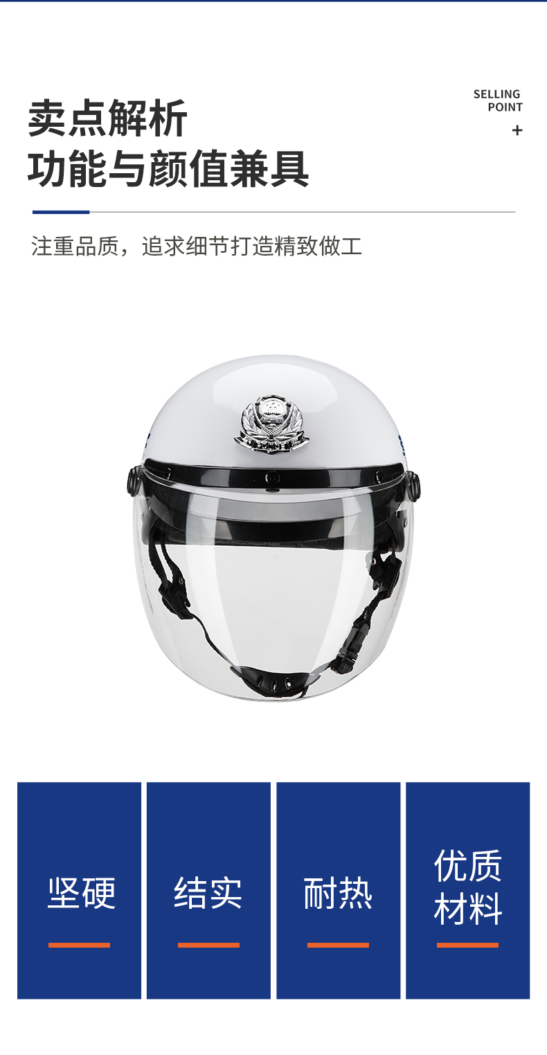 MTK-X-02警用摩托车头盔(夏盔)是一种用于防止头部及面部受到打击或其他潜在的伤害性攻击的警用装具。本头盔采用高强度ABS和PC材料制造,头盔由壳体、缓冲层、佩戴装置、面罩等组成,头盔具有外形美观、防雾、视野宽阔、透光率好、佩戴牢靠、舒适、解脱方便等特点。是警务人员在日常执勤巡逻中保障自身的必备防护装备。