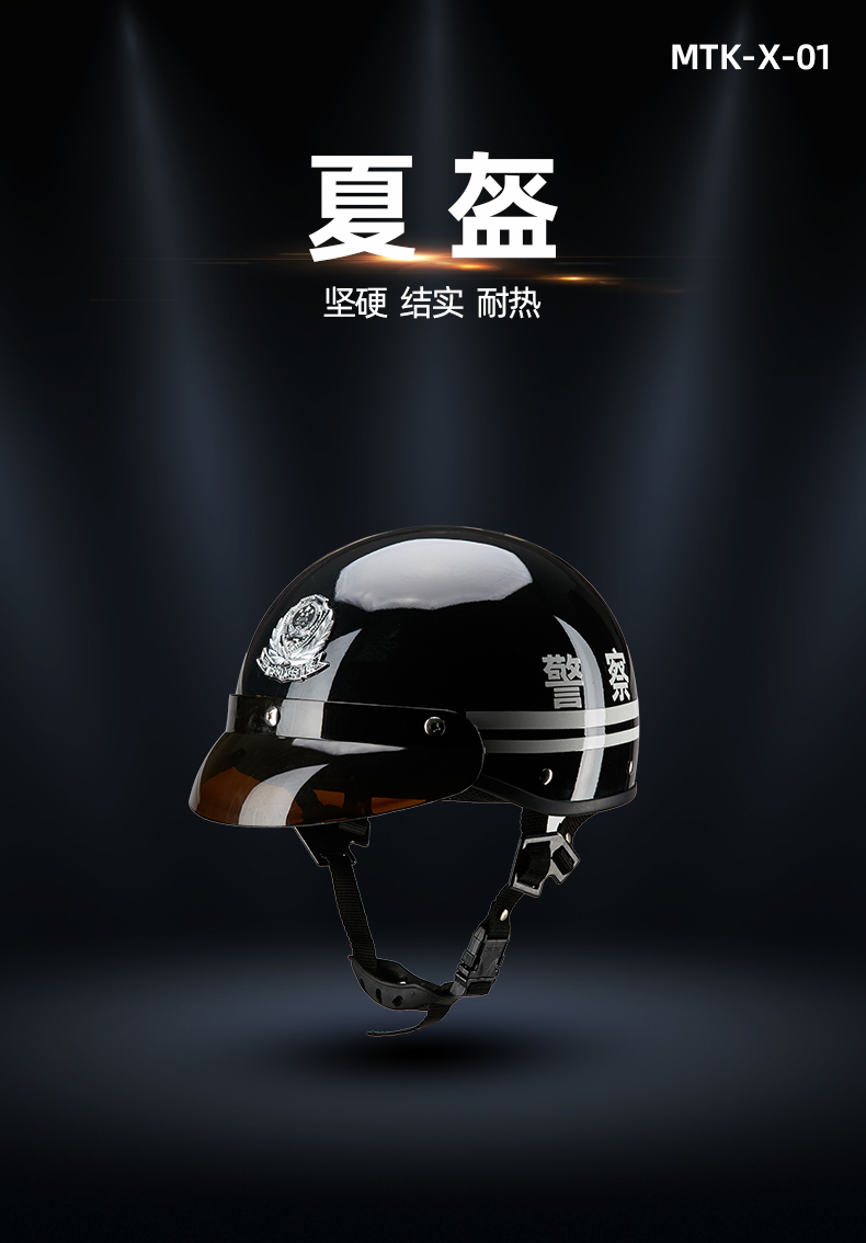 MTK-X-01警用摩托车头盔(夏盔)是一种用于防止头部及面部受到打击或其他潜在的伤害性攻击的警用装具。本头盔采用高强度ABS和PC材料制造,头盔由壳体、缓冲层、佩戴装置等组成,具有线条流畅,视野宽阔,透光率好,佩戴牢靠、舒适、解脱方便等特点,符合《GA295-2001警用摩托车头盔》标准的规定。是警务人员在日常执勤巡逻中保障自身的必备防护装备。