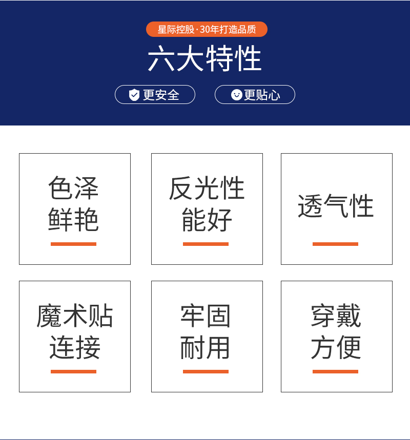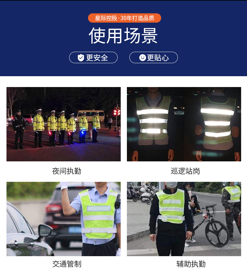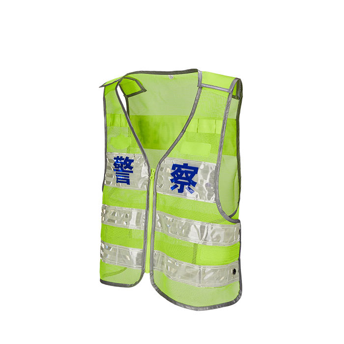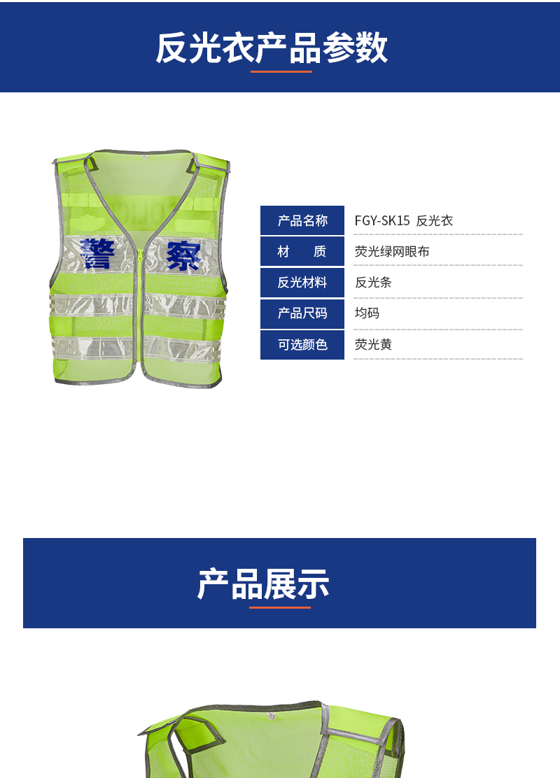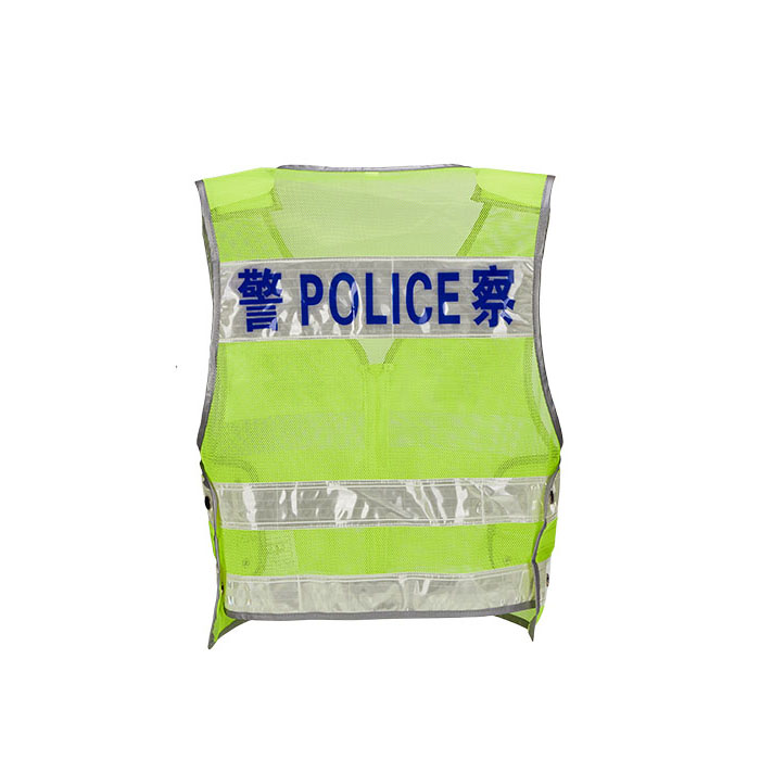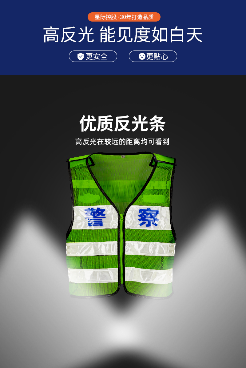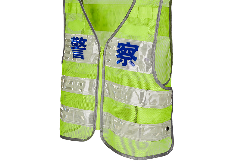 警用反光背心采用前开襟马甲式样,且腰部、肩部采用按扣连接,可针对不同体型进行多档调节,穿套更便捷。整体采用荧光绿网眼布材质,辅以多处反光条设计,透气性强的同时,增强夜间可视性。