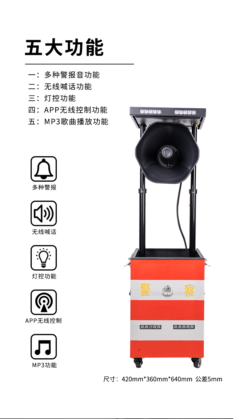 BX-150W便携式声光一体化扩音系统是我公司新开发的一款产品。它是在吸收国内外先进技术、工艺的基础上设计而成。配备免维护供电,300W、150W、100W可选式电声扩音系统;设计符合国家相应标准,运输方便。该产品主要可用于交通执法、交通预示、大型公安、治安等场所指挥;也可用于高速道路疏通、警示、预警及交通检查、森林防火、大型水库险情、监狱等场所作广播、警报设备之用(具体功能有所不同)。