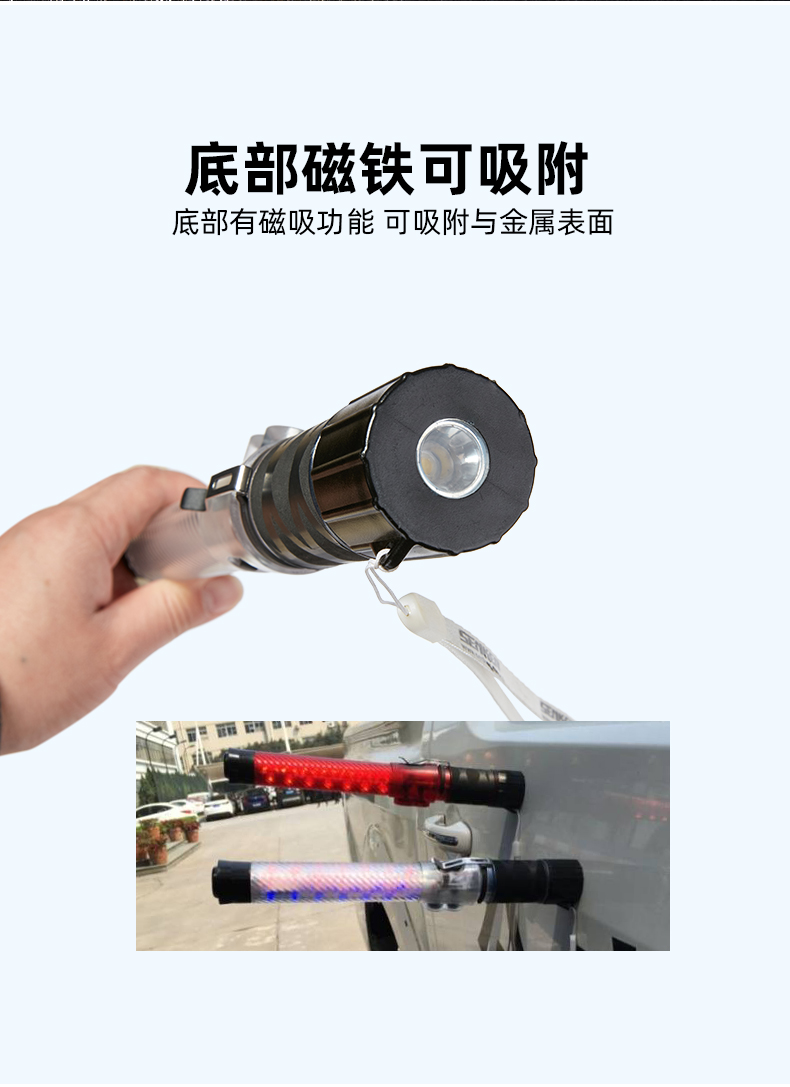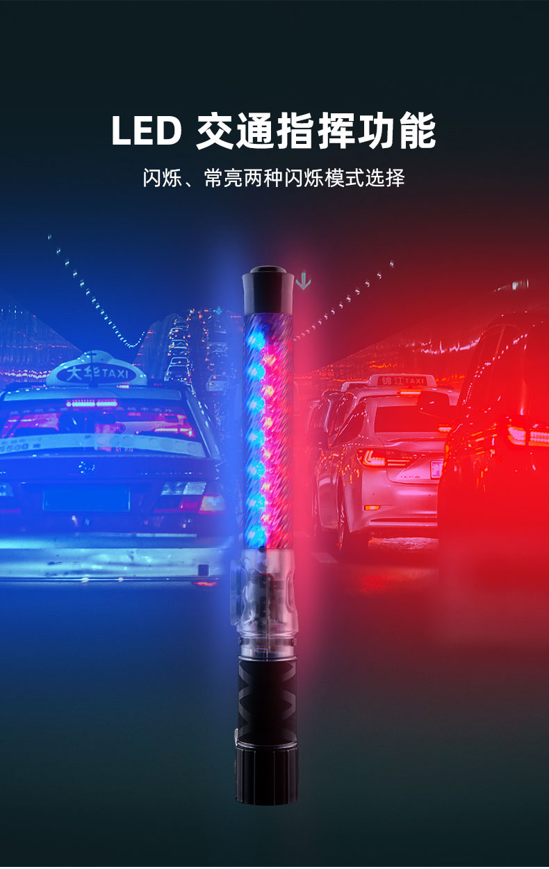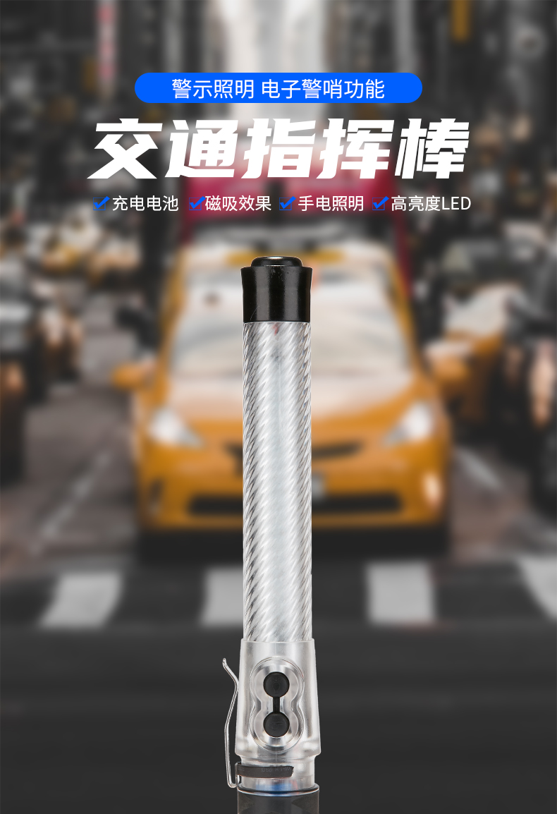 该产品是集声、光为一体的高效交通指挥工具。具有LED 交通指挥棒、大功率LED手电筒、电子警哨、磁吸等功能。可广泛应用于交通指挥、施工现场、设卡临检及一些特殊场所。