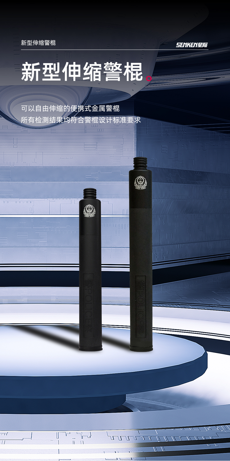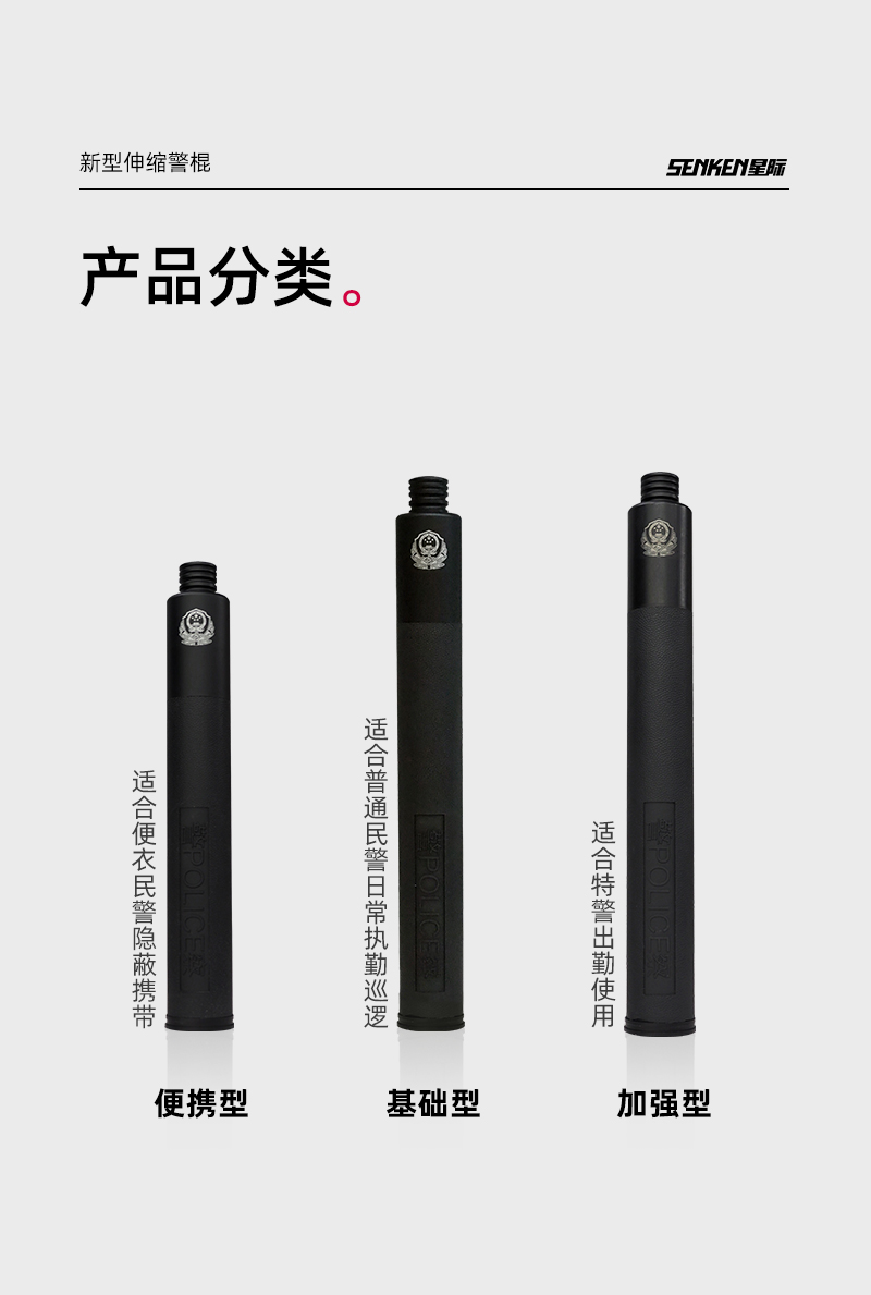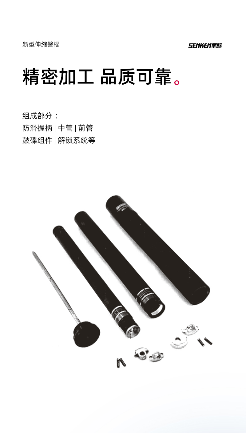 新型机械伸缩警棍是可以自由伸缩的便携式金属警棍,针对不同警种需要,在保证足够击打强度的前提下,分为便携型(适合便衣民警隐蔽携带)、基础型(适合普通民警日常执勤巡逻使用)和加强型(适合特警出勤使用)。新型机械伸缩警棍主要由防滑握柄、中管、前管、鼓碟组件、解锁系统等组成,且所有检测结果均符合警棍设计标准要求。