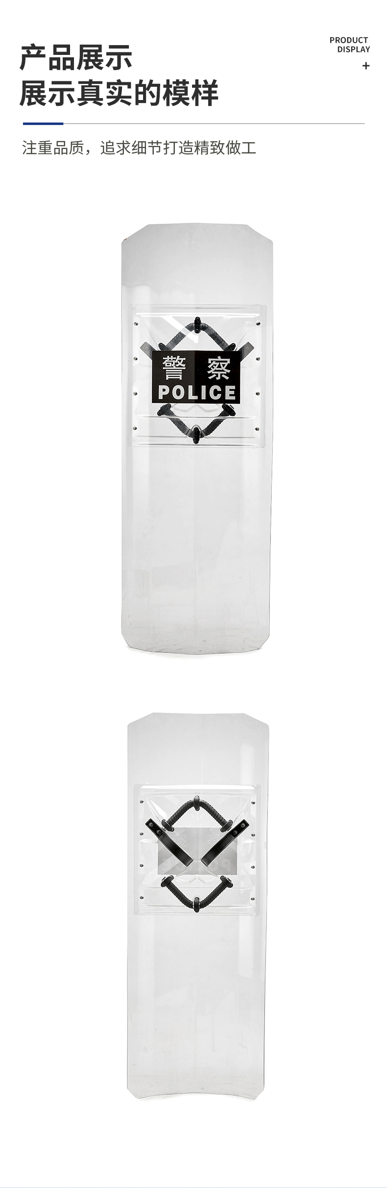 新一代防暴盾牌采用耐用的聚碳酸酯制成,通过综合提高性能和设计,在持续的暴力冲击过程中,能抵挡滑膛枪发射3mm的散弹,也能防御瞬间汽油燃烧弹所带来的高温灼伤的危险,筑起安全防护的持久防线。同时,盾牌背部的加强板可有效降低双手的冲击与振动,盾牌的V型面设计亦可有效化解各个方面过来的重击。