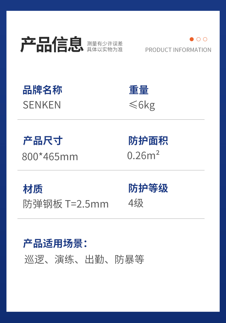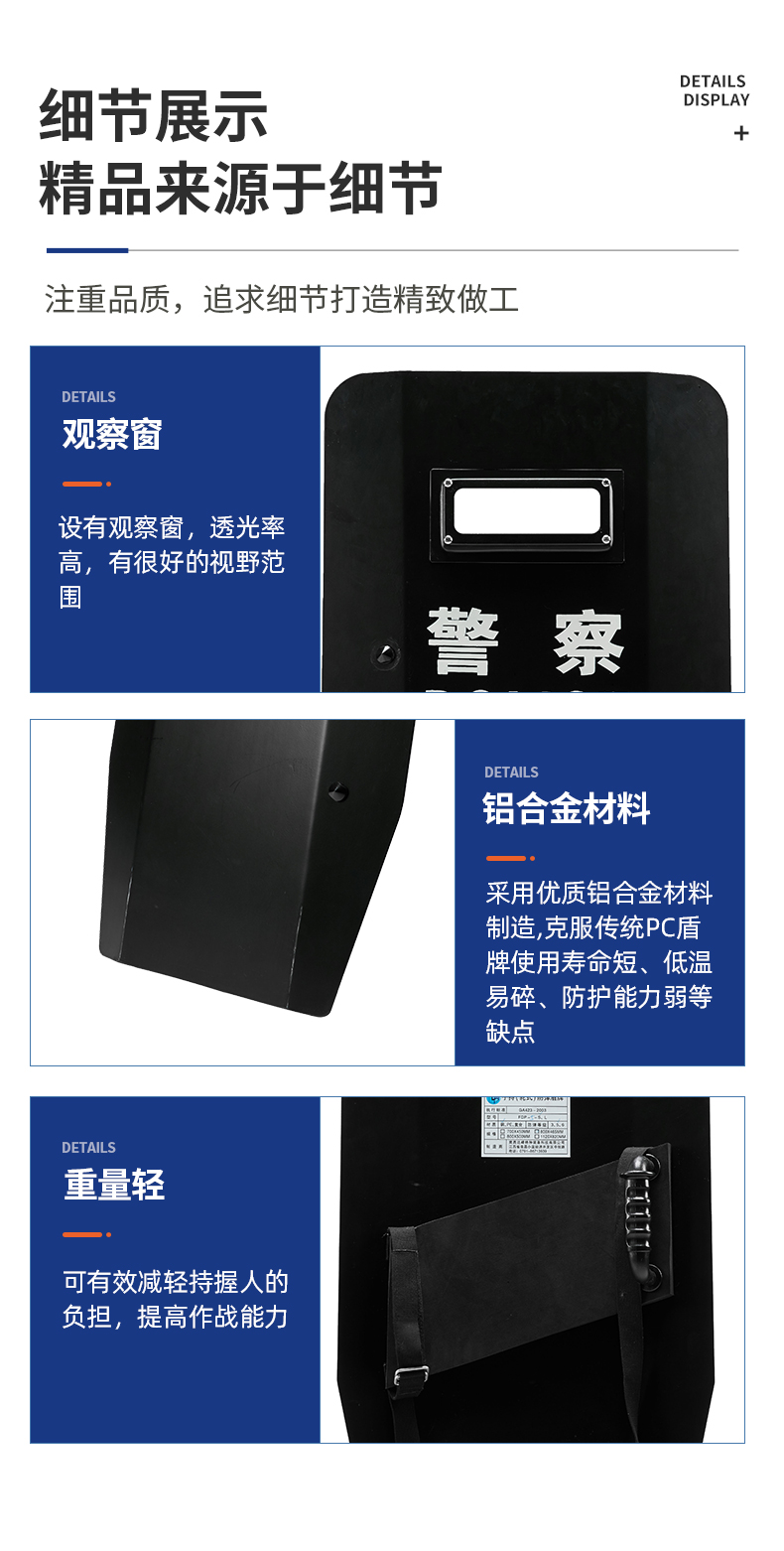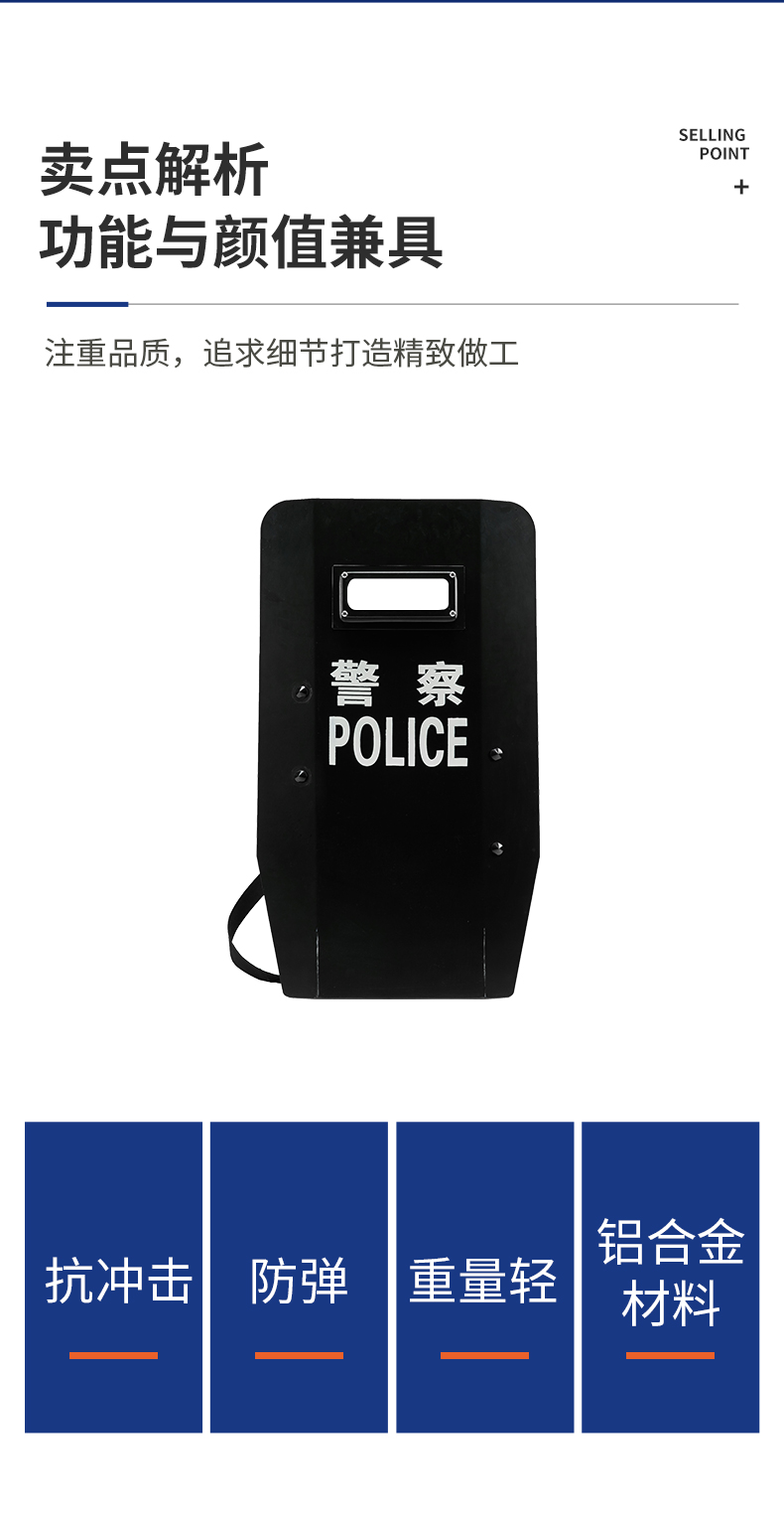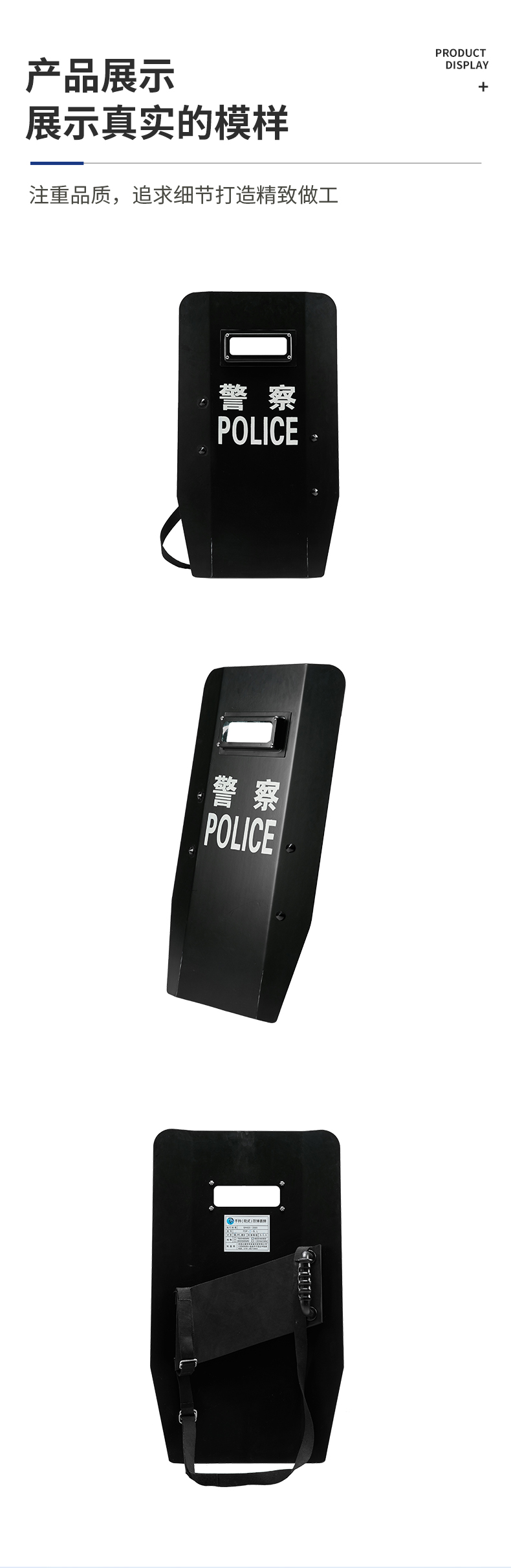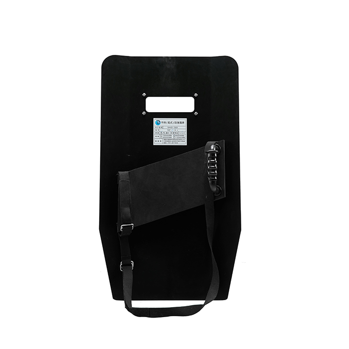 手持式防弹盾牌采用2.5mm厚的进口防弹钢板整体切割而成。盾体通过机械压形、表面磷化、喷塑等工艺完成,盾牌上的瞭望窗口采用17mm厚,两面粘有防弹铁甲膜的防弹玻璃,能防止玻璃被弹击后飞溅物飞溅,更有效的防护自身安全。