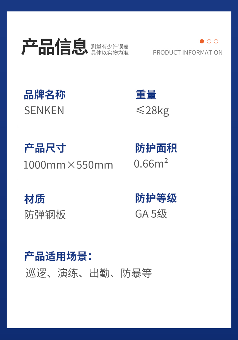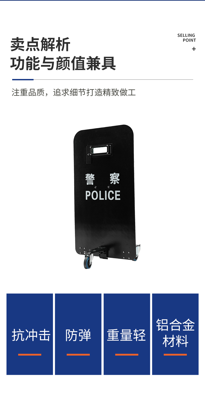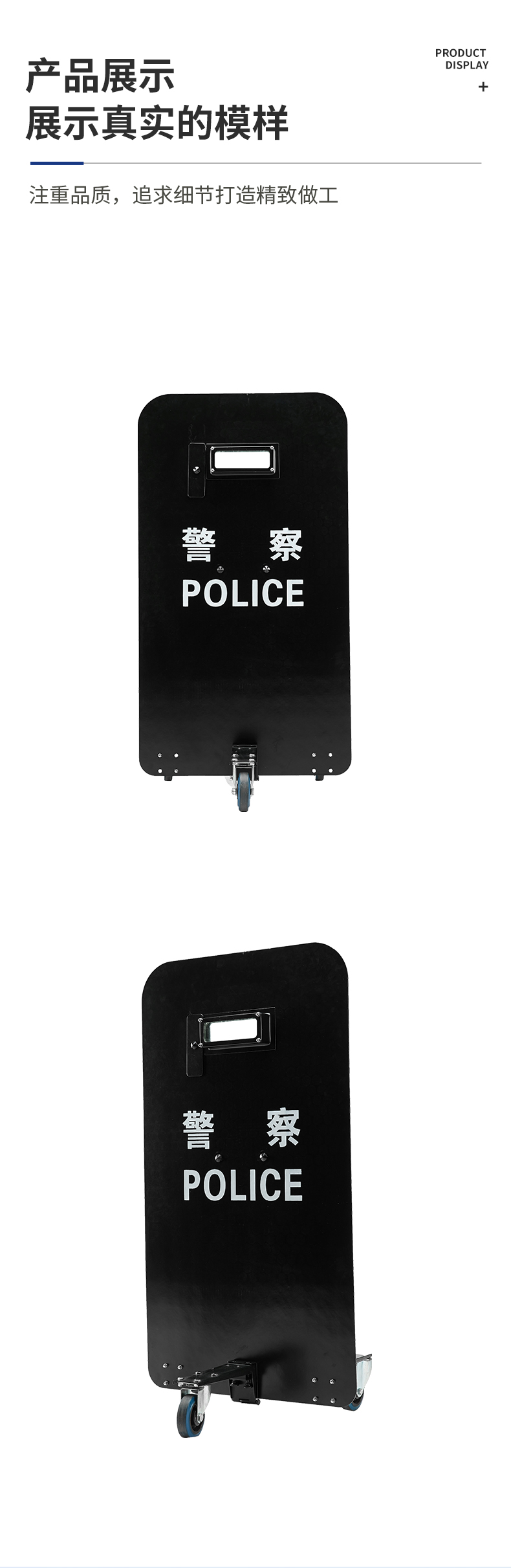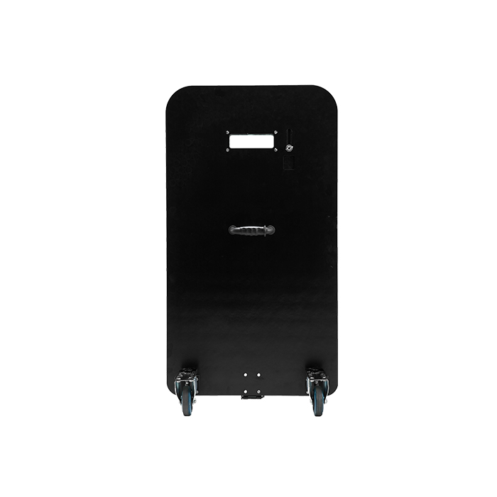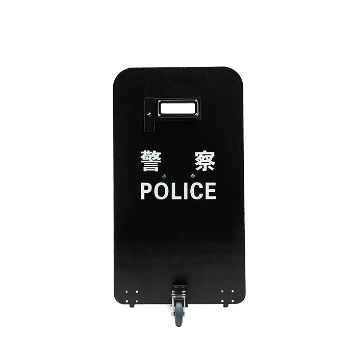 轮式防弹盾牌采用金属材料制造。具有使用灵活、防护面积大,防弹级别高等特点。 可防56式半自动步枪发的7.62mm普通弹。使用时可单人多角度推进,也可多人并排平移形成防弹隔离墙,威逼暴徒,达到自卫反恐的目的。
