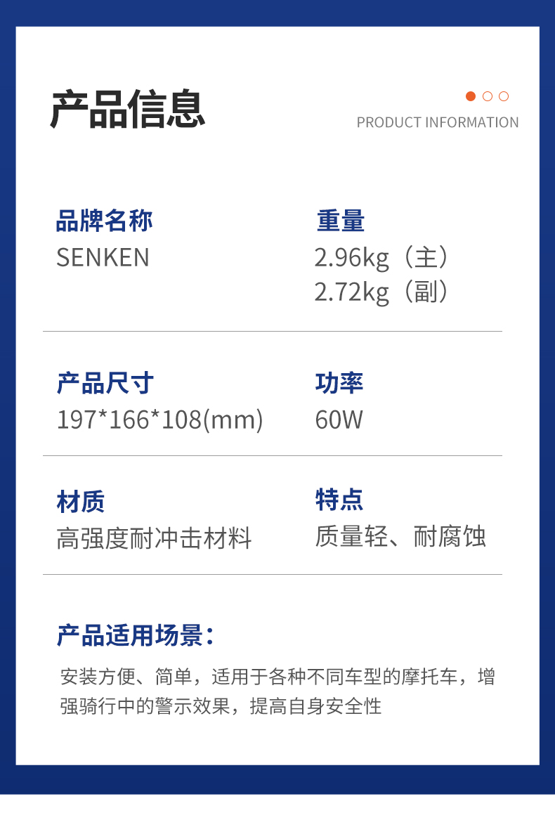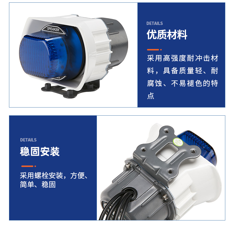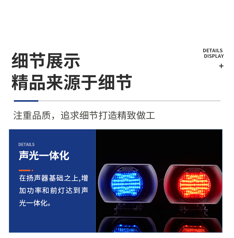 CJB55DM声光一体化摩托扬声器,填补行业空白; 每套有主、副扬声器; 高强度耐冲击材料,质量轻、耐腐蚀、不易褪色; 产品安装方便、简单,适用于各种不同车型。