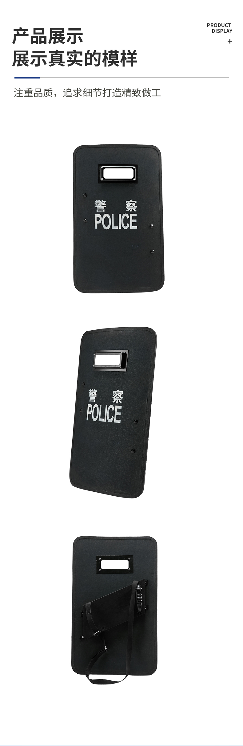 盾体通过机械压形、表面磷化、喷塑等工艺完成,盾牌上的瞭望窗口采用高性能玻璃材质,两面粘有防弹铁甲膜的防弹玻璃,能防止玻璃被弹击后飞溅物飞溅,更有效的防护自身安全。