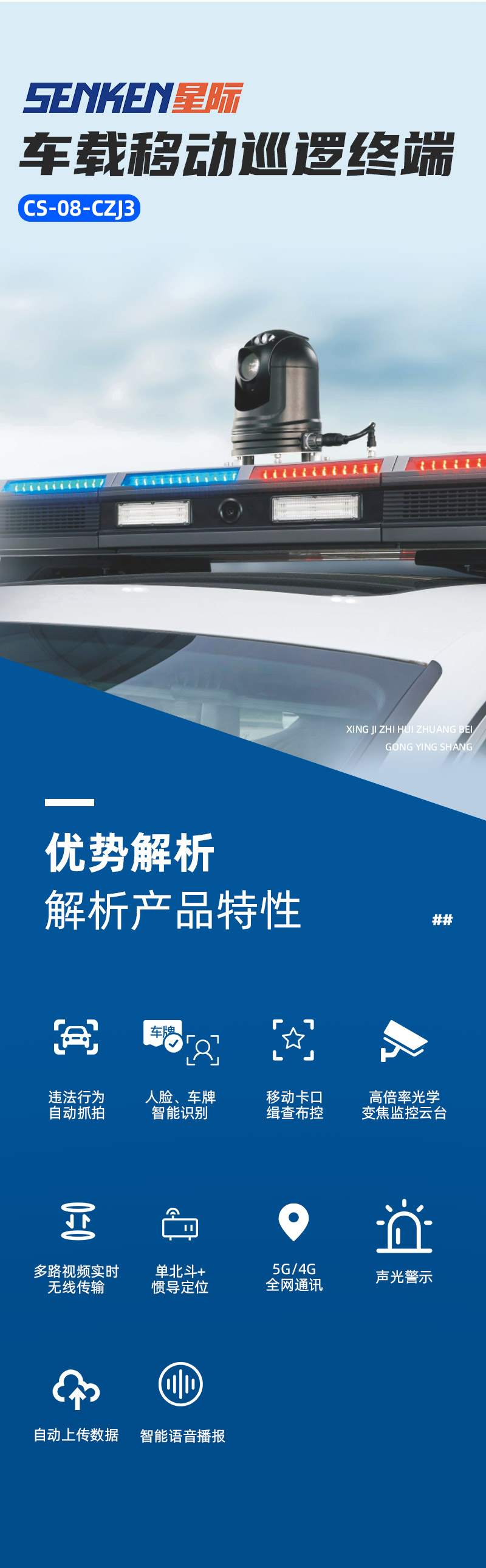 在第二代移动智能巡逻终端的基础上,对外观和结构部分进行了提升,并增加更多智能分析的功能,能够对来往车辆和来往人员进行特征分析,提取车牌号、车牌颜色、人脸等特征信息,并对其进行数据结构化。广泛应用于110巡逻、交警巡逻等。